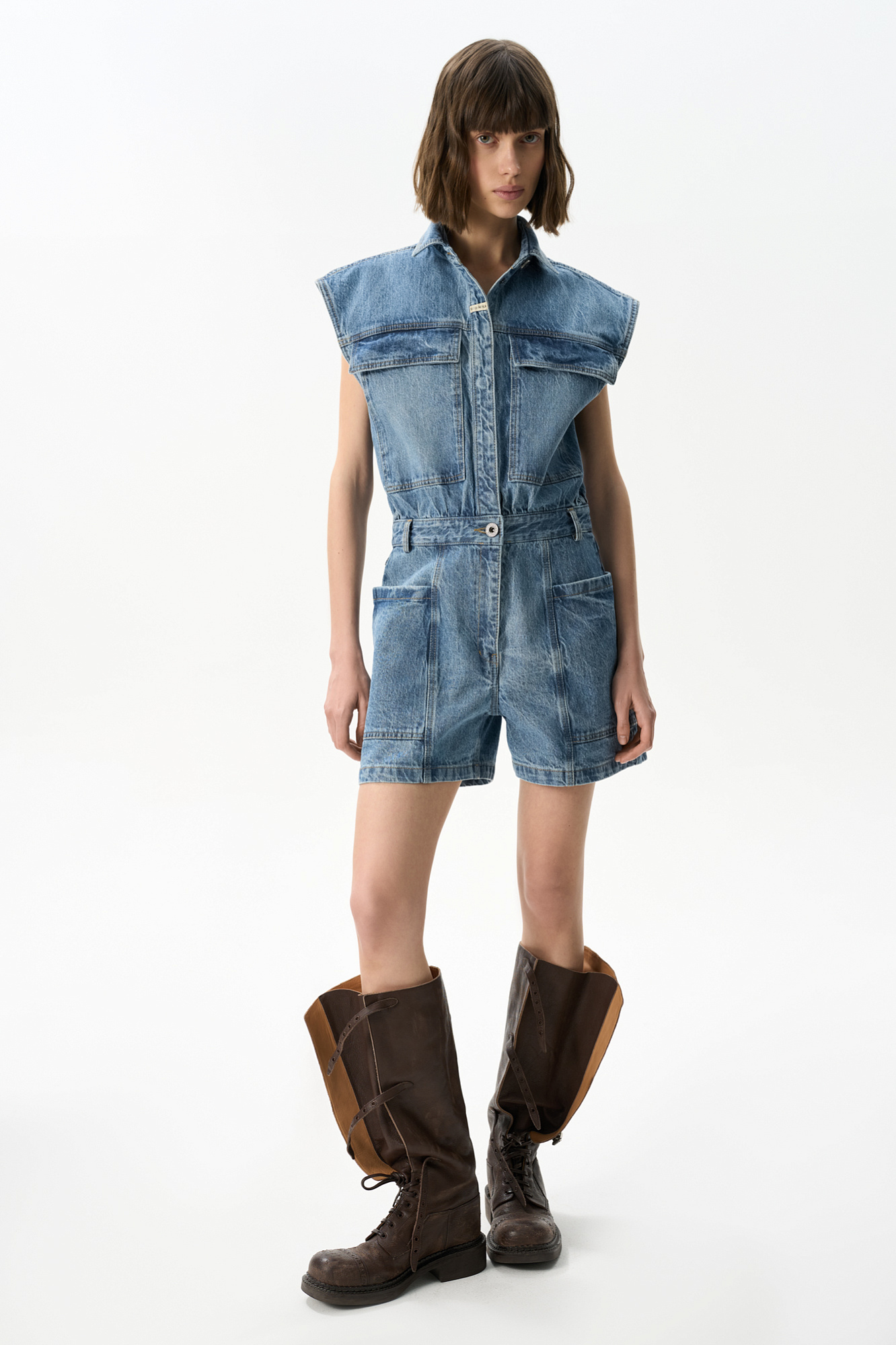 Джинсовый комбинезон из 100% хлопка. Модель с рубашечным верхом и шортами. Изделие с классическим отложным воротником, короткими рукавами-крылышками и застежкой на металлические пуговицы, шлевками на поясе для ремня и большими накладными карманами.