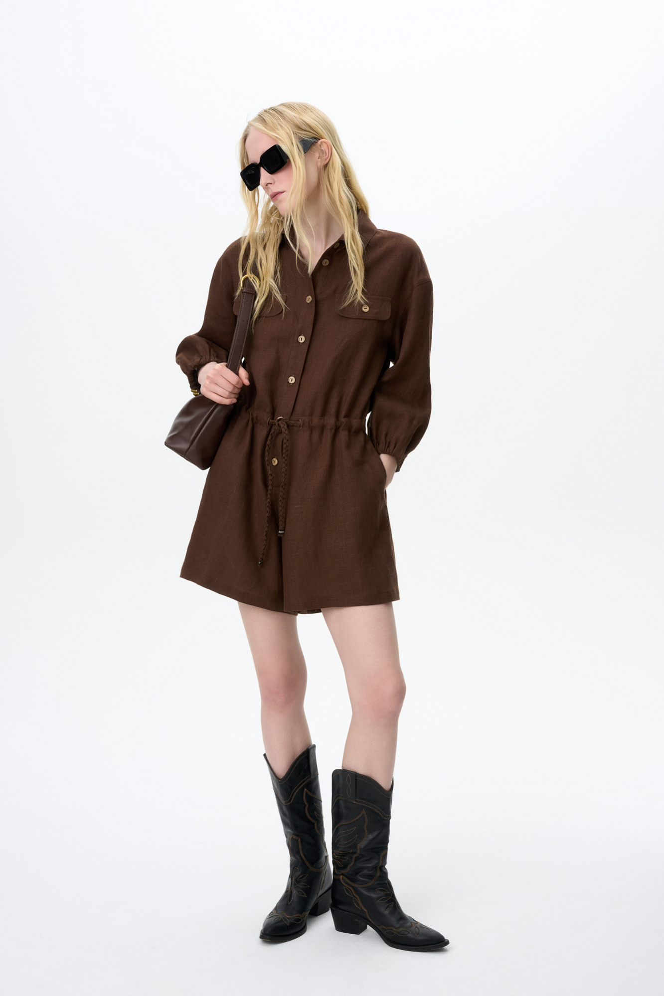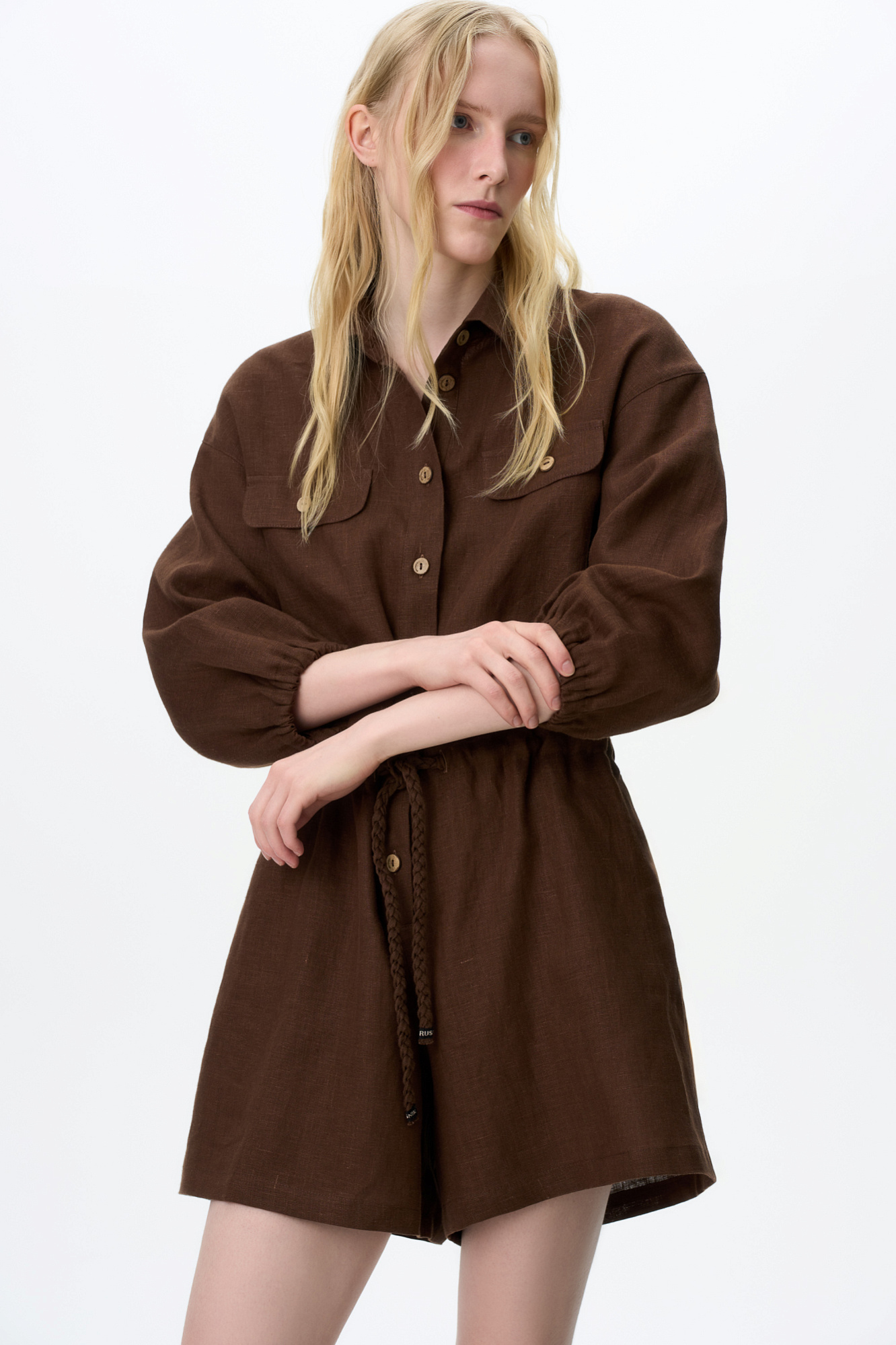 Комбинезон из 100% льна. Модель с рубашечным верхом, отложным воротником, накладными карманами на груди, длинными рукавами и застежкой на пуговицы. Регулируемая кулиска на поясе.