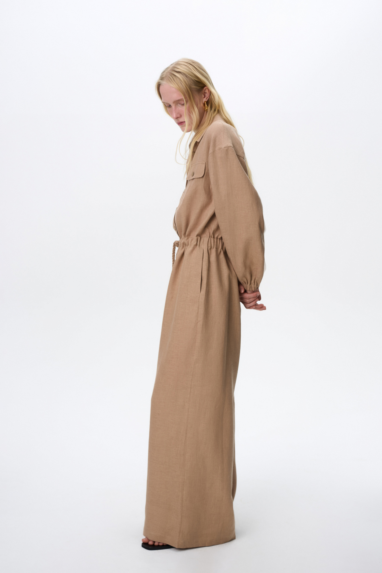Комбинезон из 100% льна с накладными карманами на груди, длинным рукавом. Застежка на пуговицы.