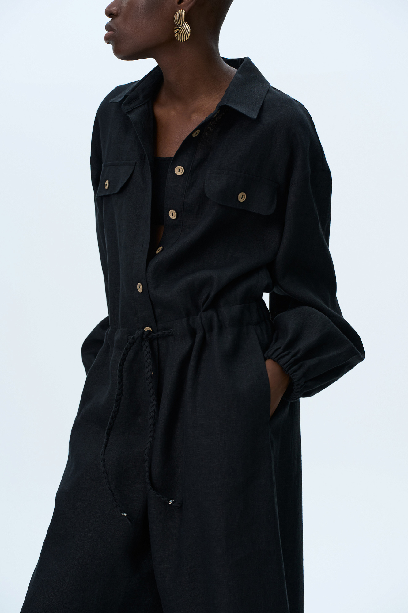 Комбинезон из 100% льна с накладными карманами на груди, длинным рукавом. Застежка на пуговицы.
