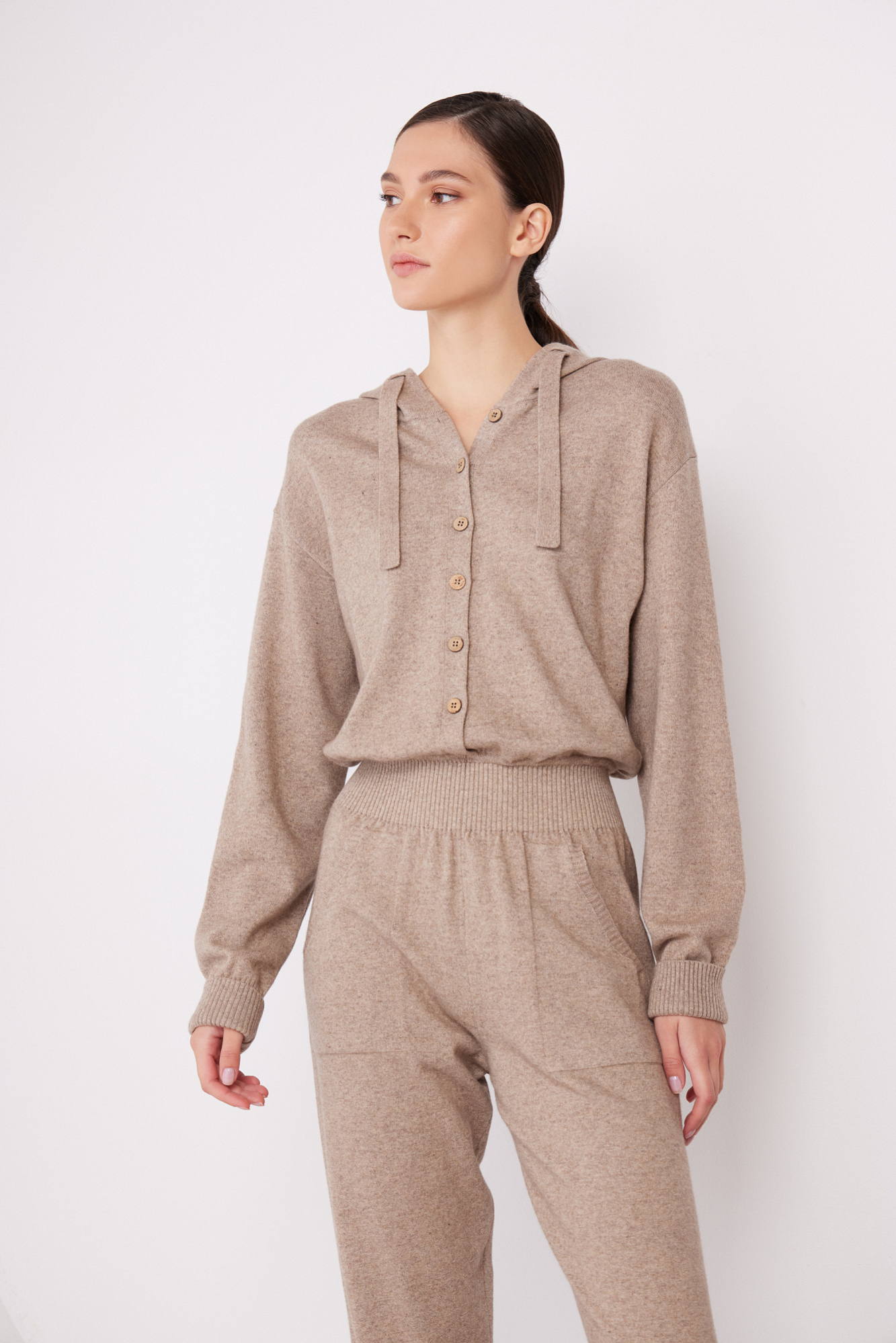 Трикотажный комбинезон из шерсти и кашемира, состоящий из худи и брюк. Худи с капюшоном и застежкой на пуговицы, брюки с широким эластичным поясом, боковыми карманами и манжетами на резинке.