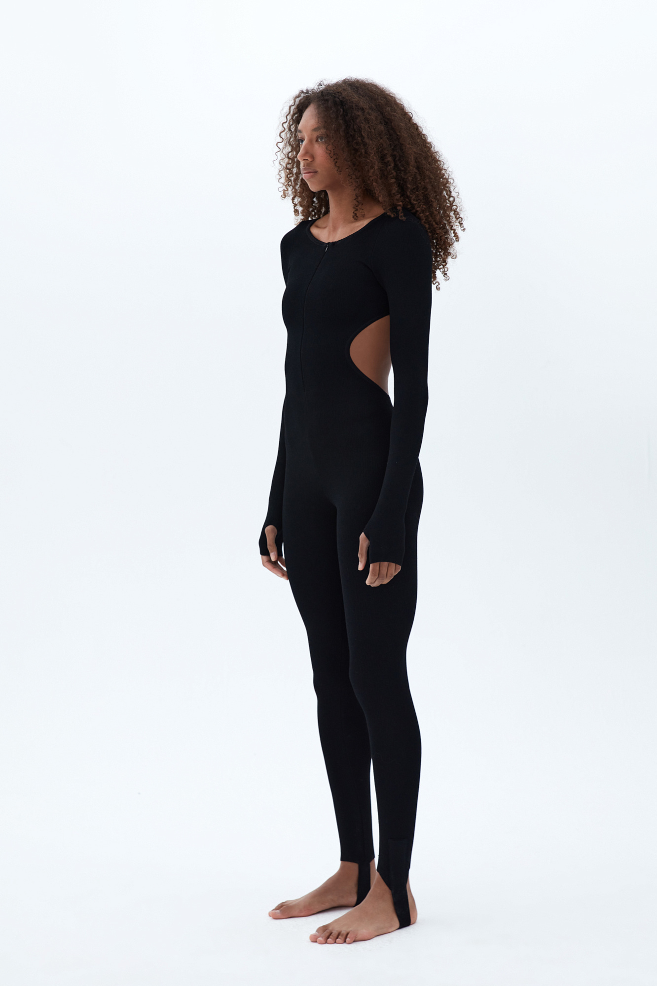 Трикотажный комбинезон из плотной вискозы с вырезом на спине. Застежка на молнии, митенки на рукавах.