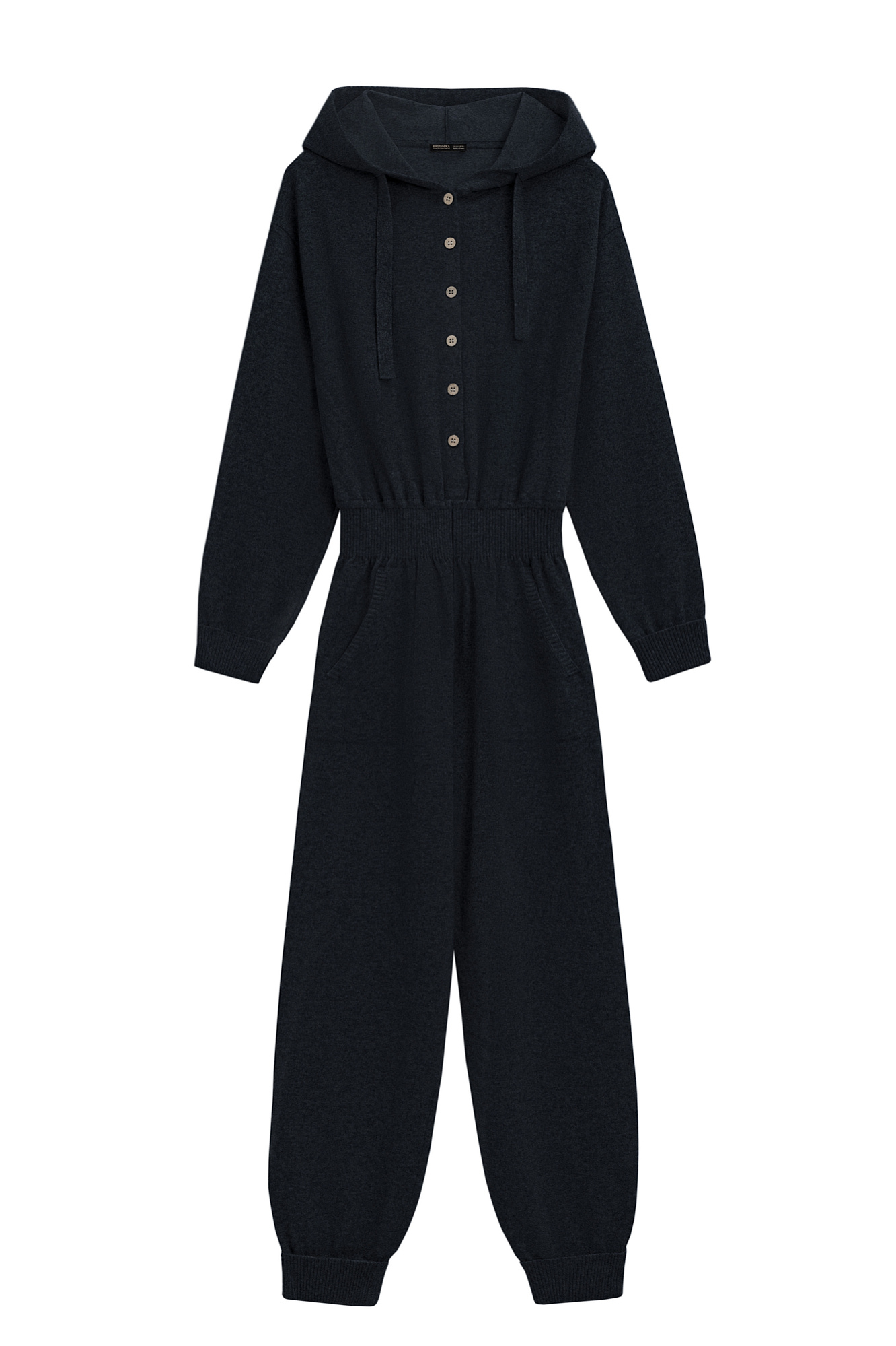 Трикотажный комбинезон из шерсти и кашемира, состоящий из худи и брюк. Худи с капюшоном и застежкой на пуговицы, брюки с широким эластичным поясом, боковыми карманами и манжетами на резинке.