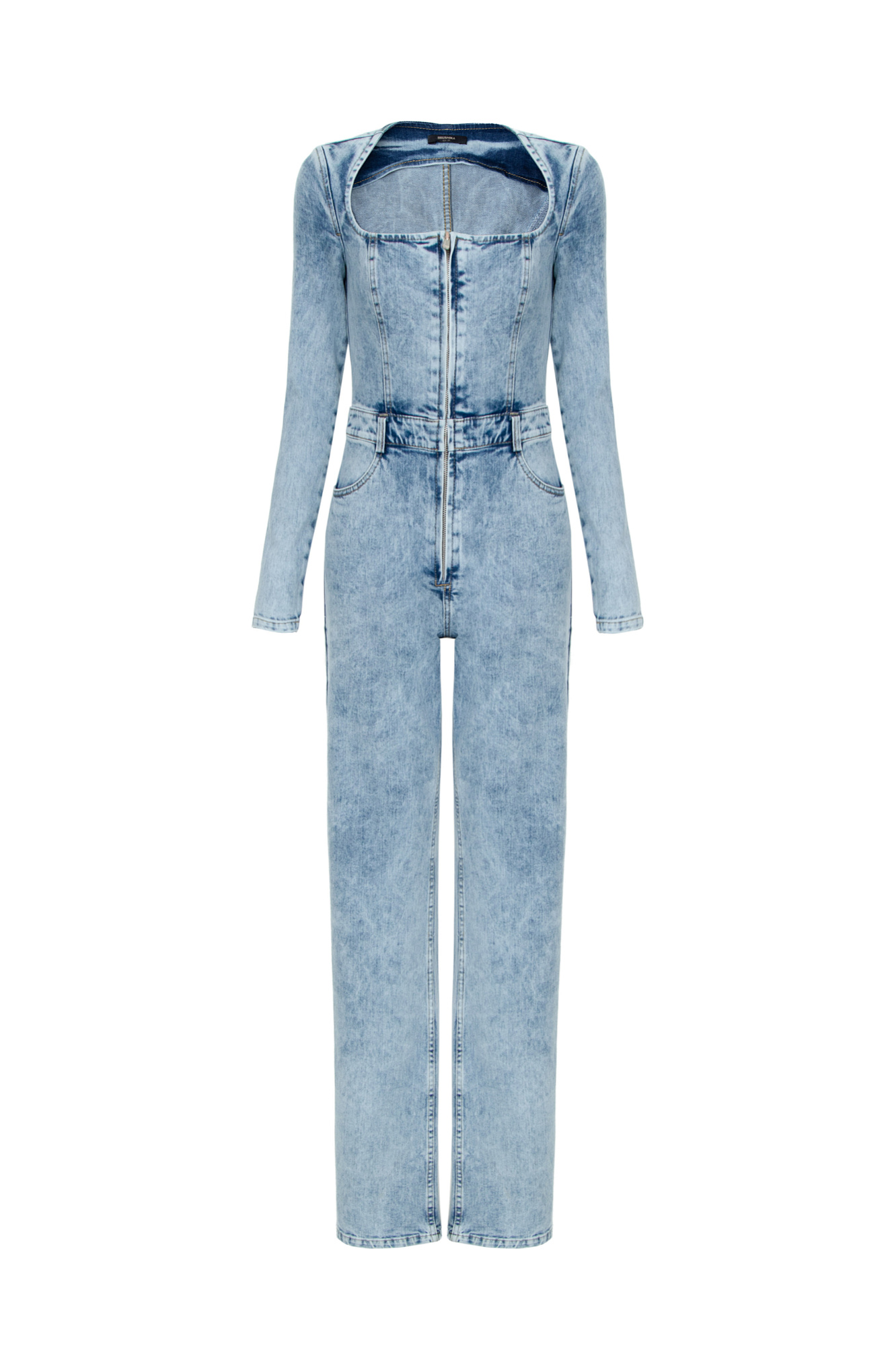 Джинсовый комбинезон с длинным рукавом. Модель приталенного силуэта с застежкой на молнию.