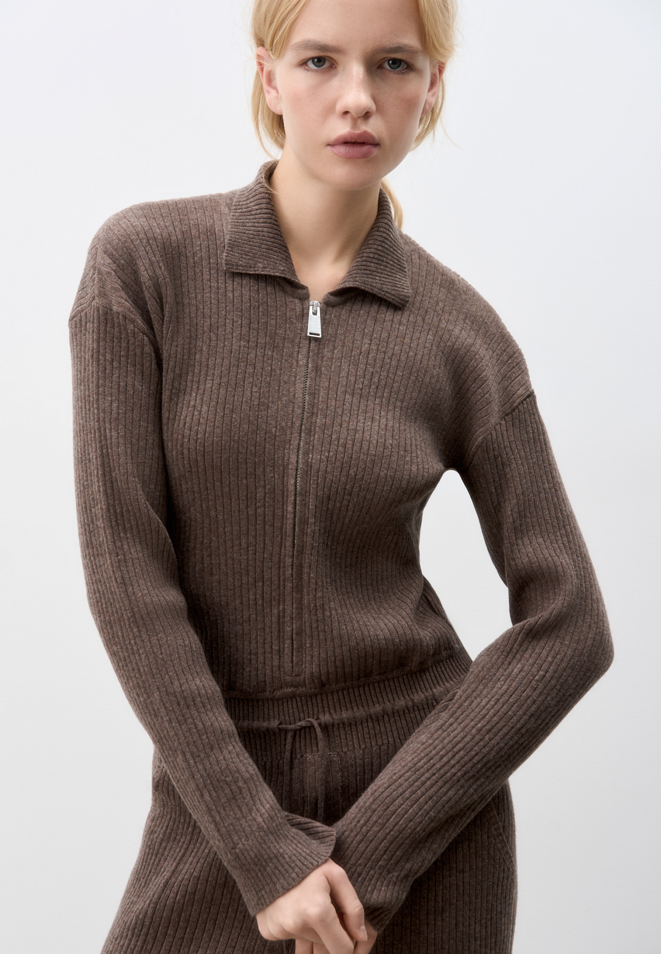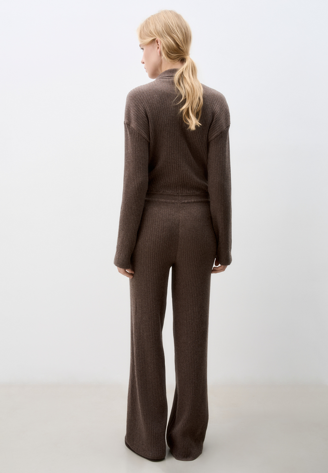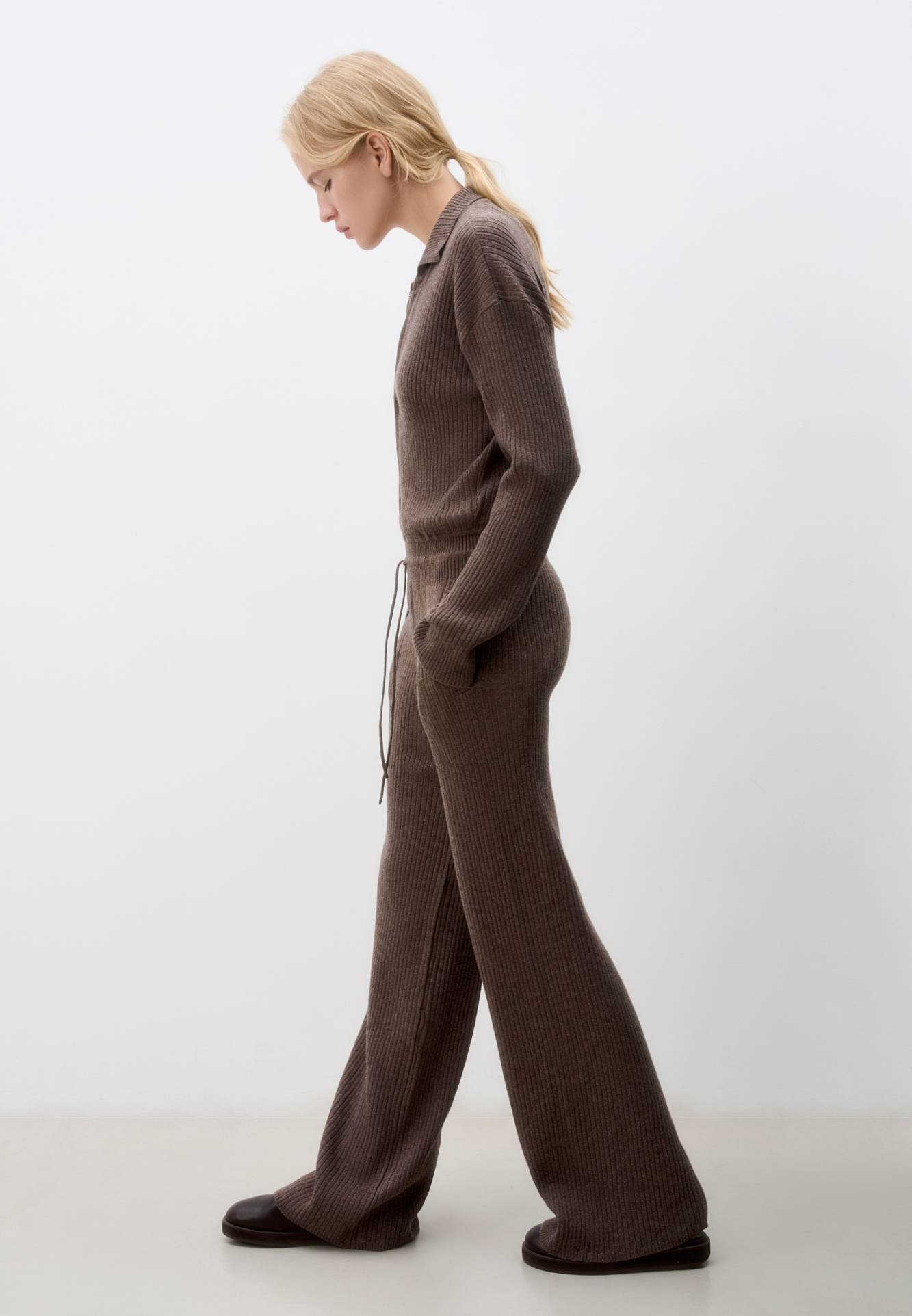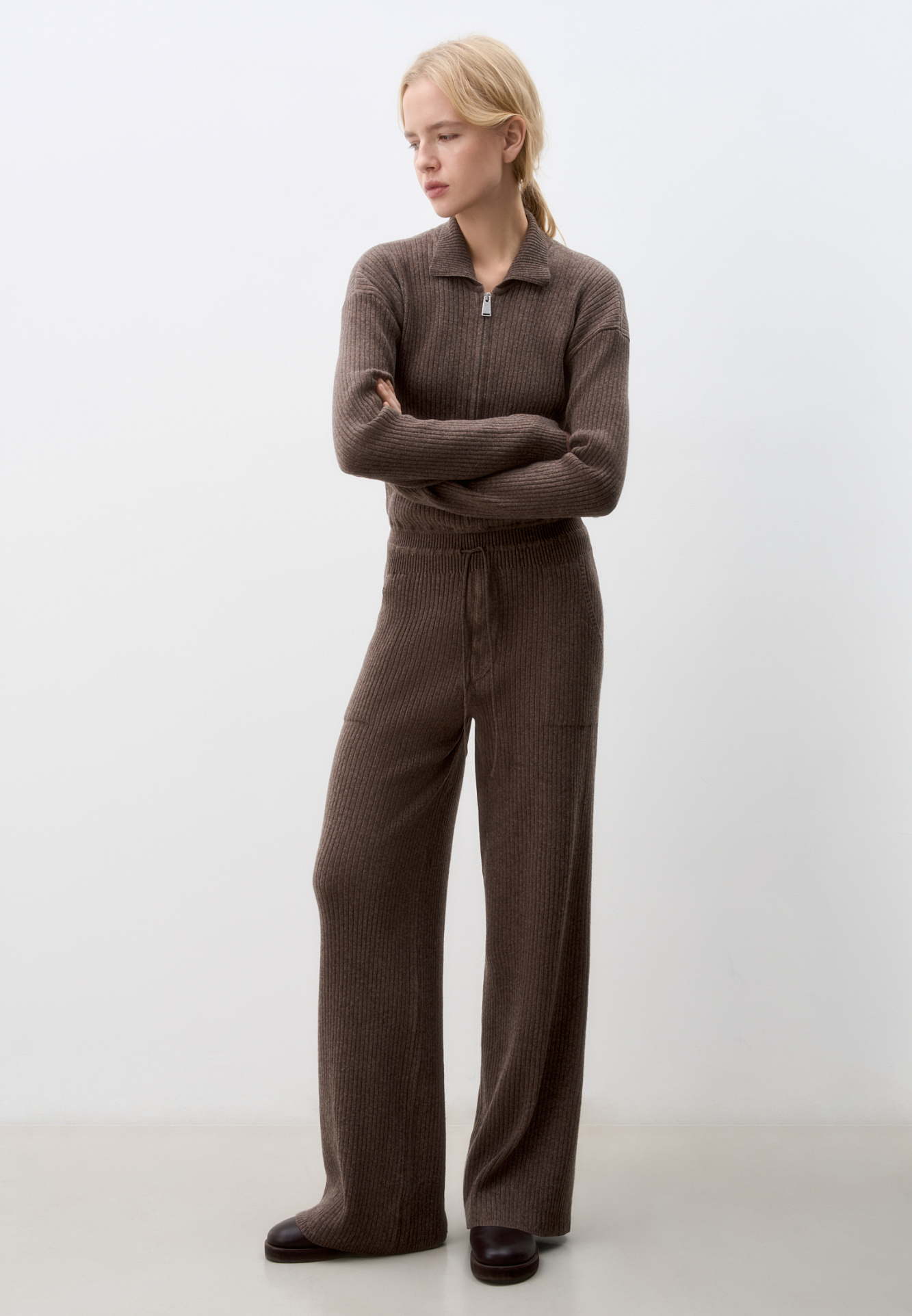Трикотажный комбинезон из смесовой шерсти с добавлением кашемира. Длинные рукава, пояс на кулиске и отложной воротник. Застежка на молнию.