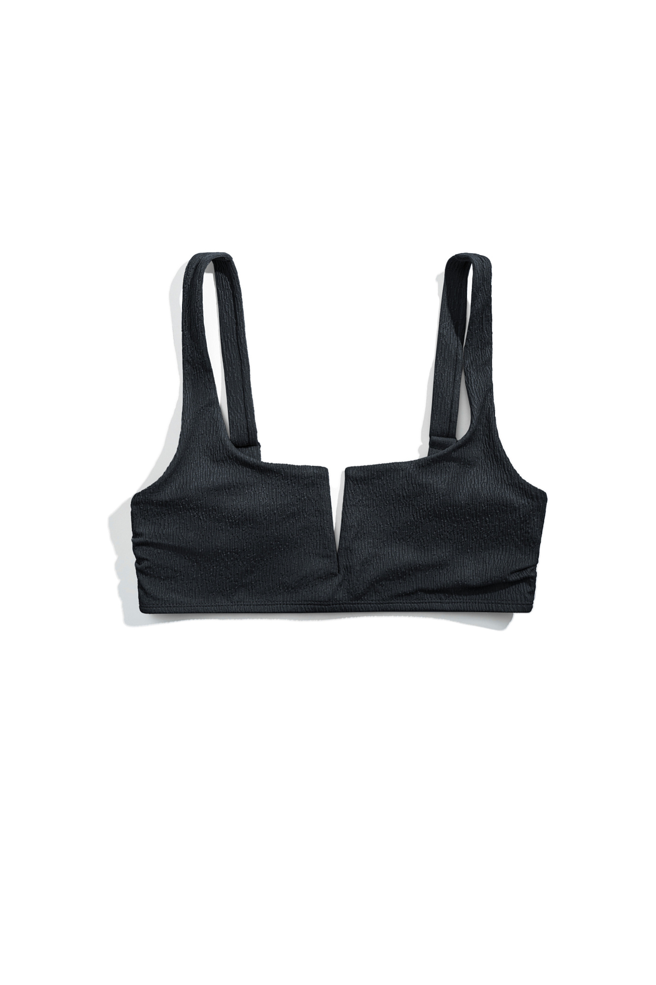 Лиф купальника с широкими бретелями и квадратным вырезом. Вырез декорирован V-образным углублением.