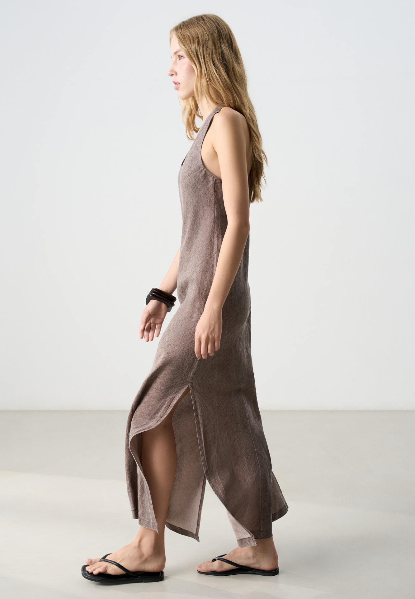 Сарафан из 100% льна длины макси. Модель свободного силуэта, без рукавов, на широких бретельках с перекрутом на спине, U-вырезом и симметричными разрезами на юбке по бокам.