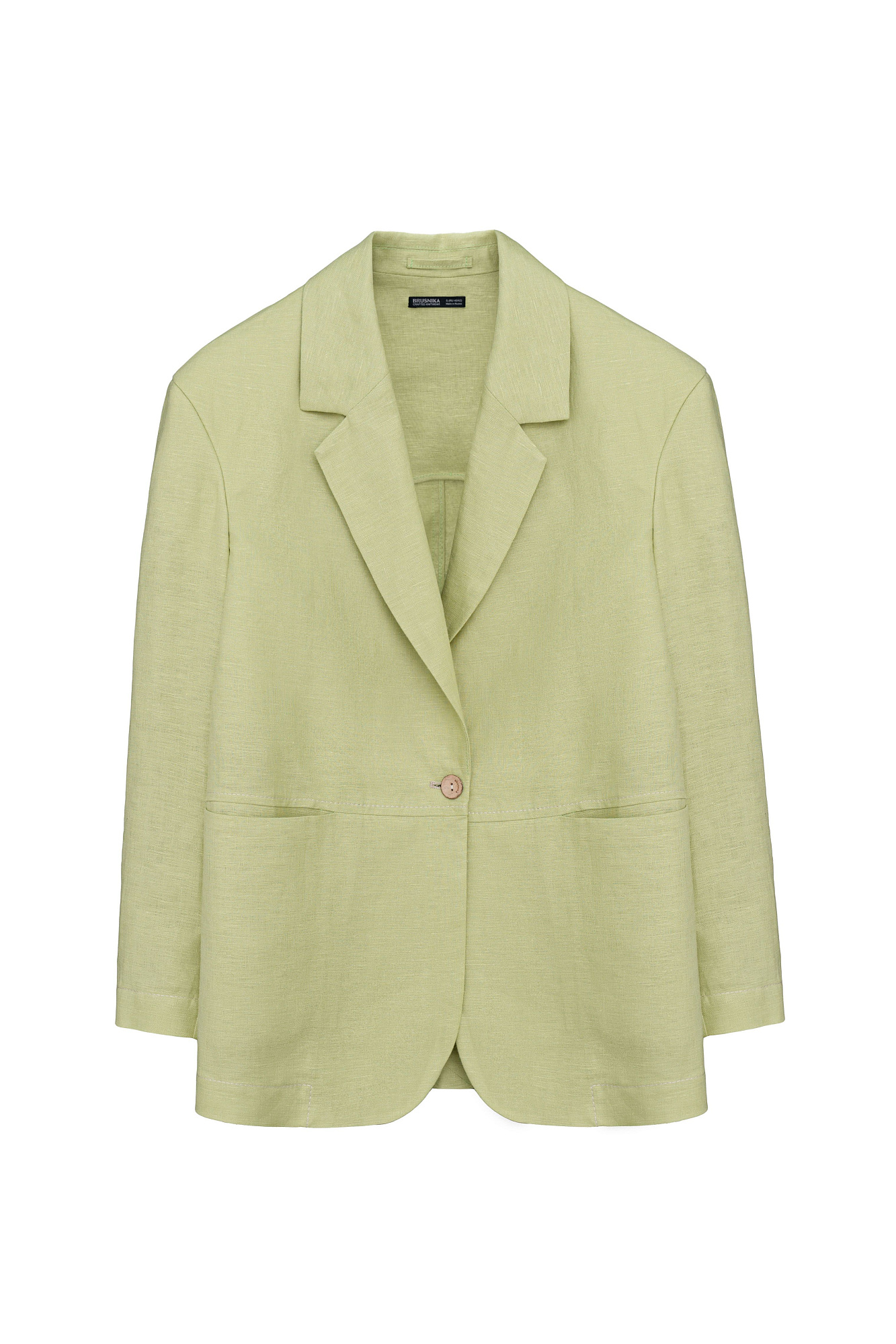 Однобортный жакет из 100% льна. Модель свободного силуэта с лацканами, манжетами на пуговицах и прорезными карманами спереди. Застежка на одну пуговицу.