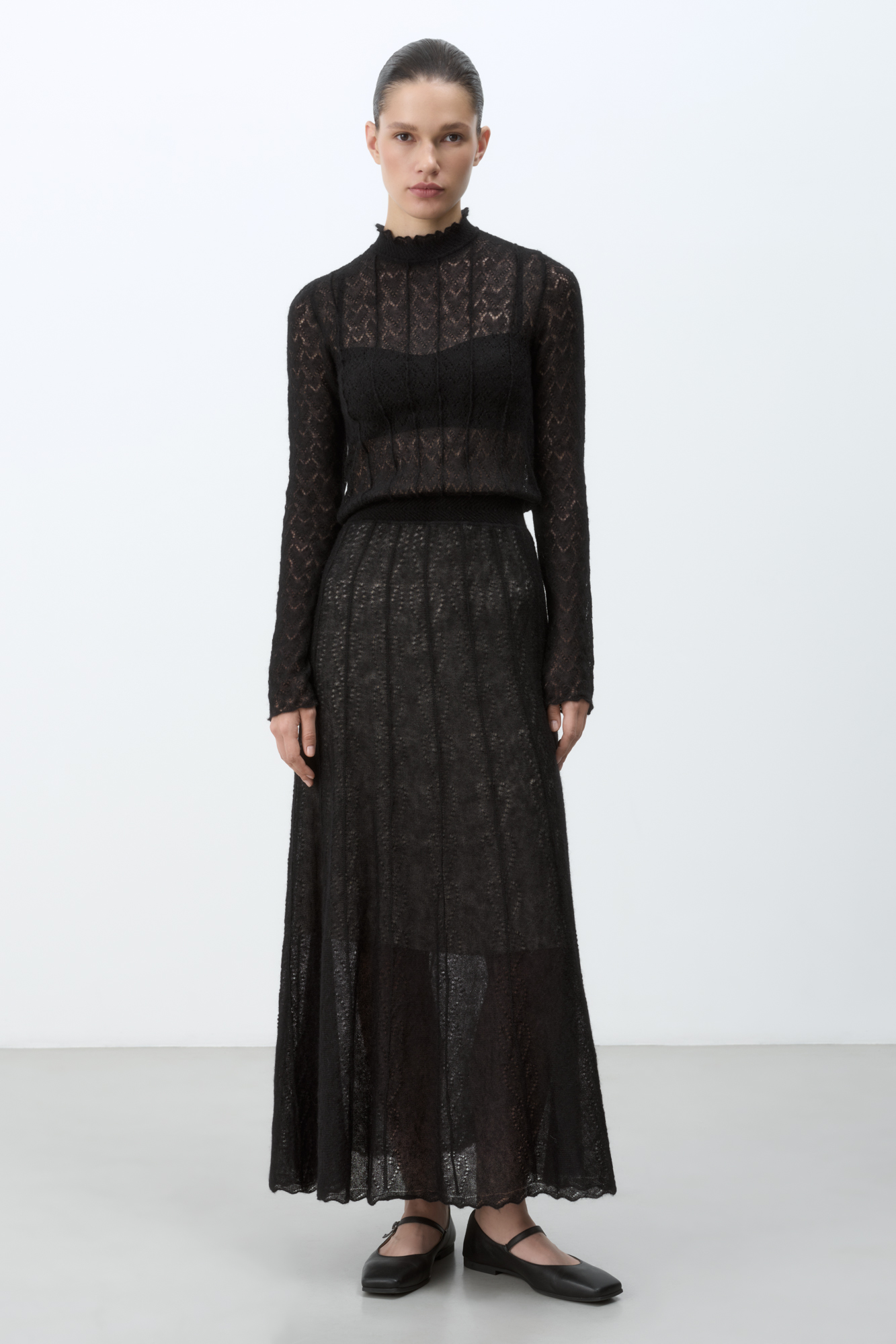 Трикотажное платье длины миди из полупрозрачного кружева с подъюбником из смесовой шерсти. Модель с длинными рукавами, невысоким воротником со сборкой и эластичным поясом. Застежка на пуговицу сзади. Платье выполнено из мягкой пряжи кид мохера и беби альпака, что позволит чувствовать себя в нем комфортно и тепло.