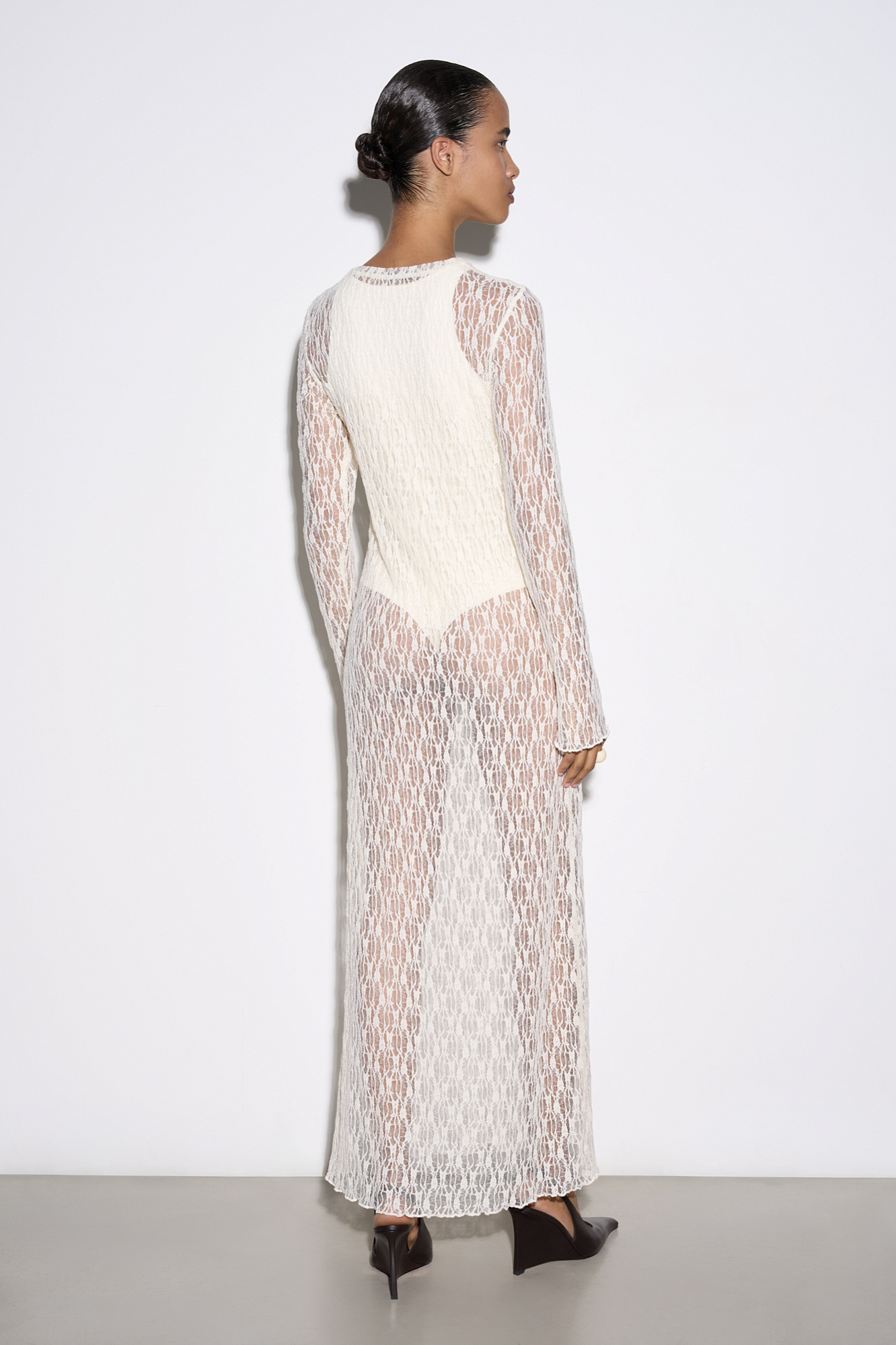 Платье длины макси из легкого кружева. Модель свободного силуэта с длинными рукавами, круглой горловиной и высоким разрезом на подоле. Изделие выполнено без подкладки.