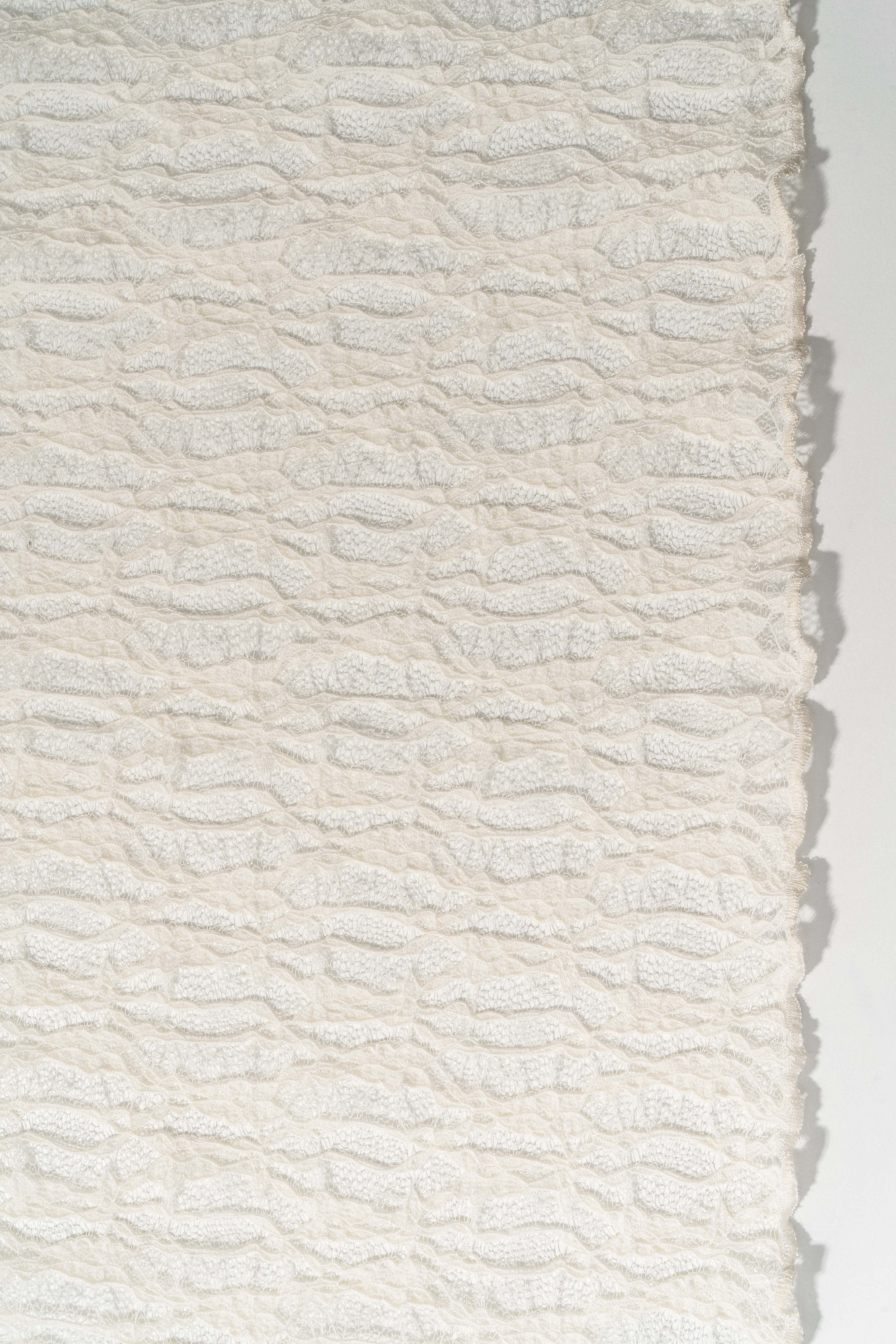 Платье длины макси из легкого кружева. Модель свободного силуэта с длинными рукавами, круглой горловиной и высоким разрезом на подоле. Изделие выполнено без подкладки.