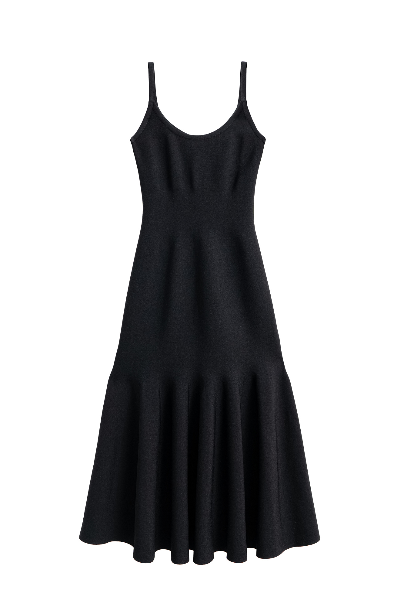 Трикотажное платье длины миди из вискозы. Модель приталенного силуэта, с расклешенной юбкой с мягкими складками, без рукавов, на узких бретелях. Застежка на молнию сзади.