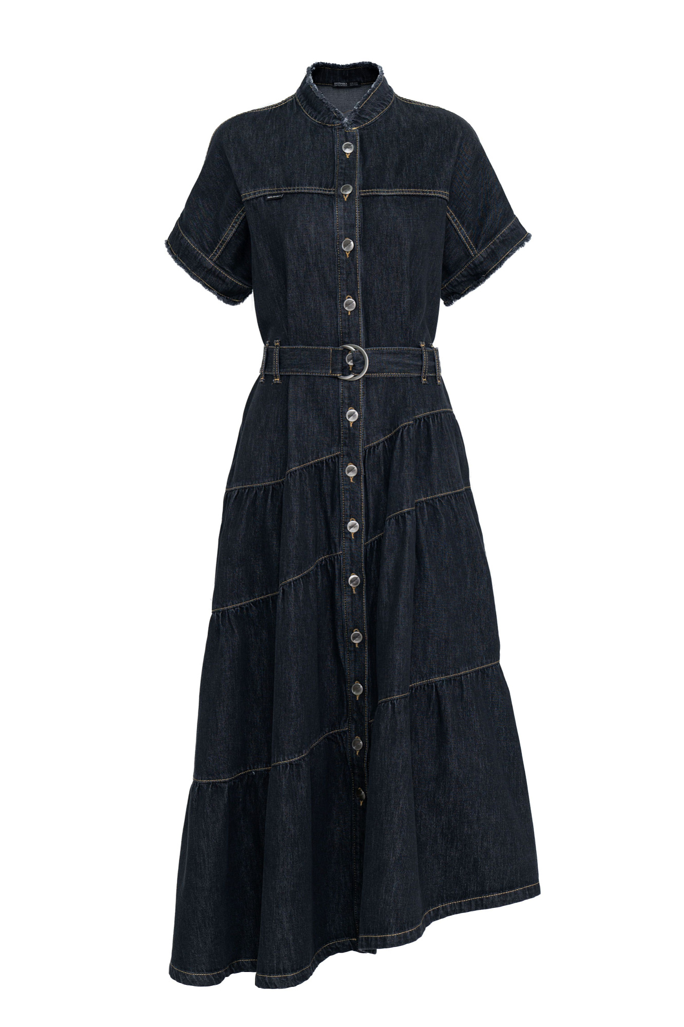Джинсовое платье-рубашка с асимметричным низом и поясом в тон. Застёжка на пуговицы обеспечит удобство надевания и регулировку глубины выреза.