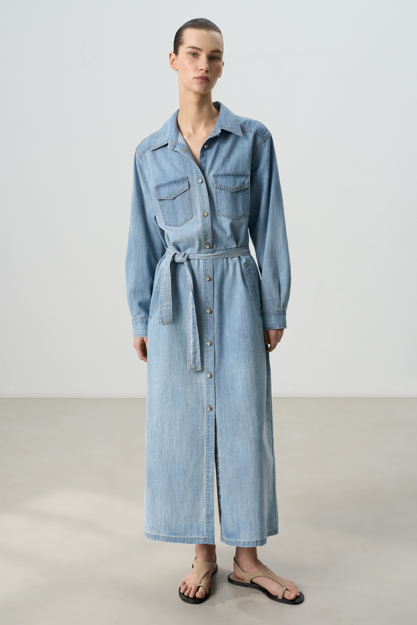 Джинсовое платье-рубашка длины миди из 100% хлопка. Модель прямого силуэта с длинными рукавами с манжетами на пуговицах, отложным воротником, двумя накладными карманами с клапанами на груди и двумя боковыми карманами. Застежка на пуговицы по вей длине.