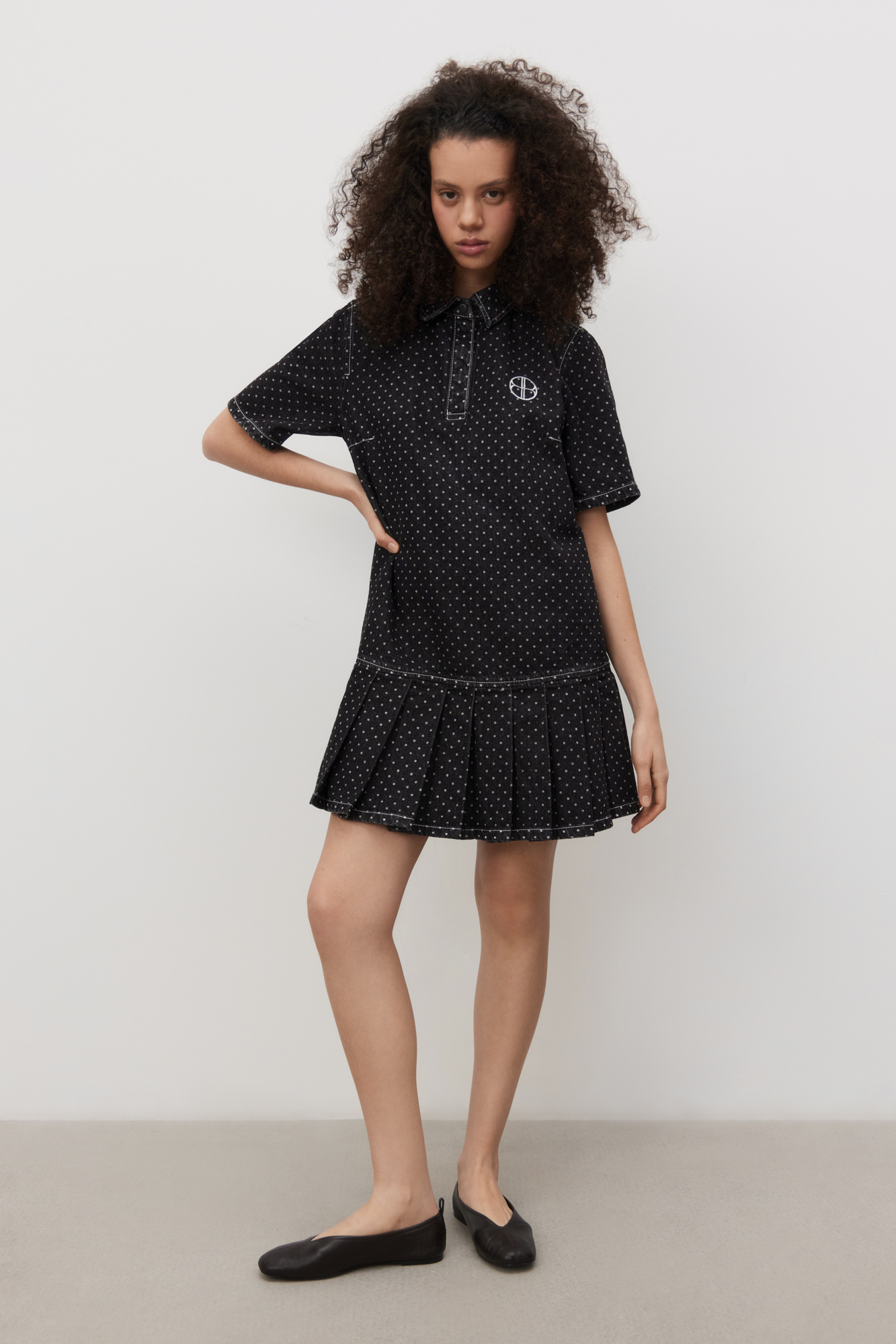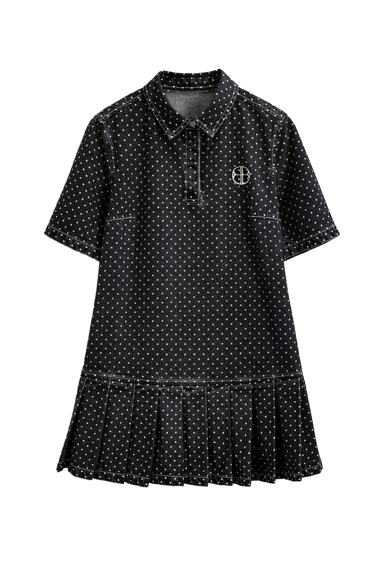 Джинсовое платье длины мини из 100% хлопка с принтом горошек. Модель прямого кроя с юбкой в складку, короткими рукавами, отложным воротником с застежкой на магнитные кнопки. К