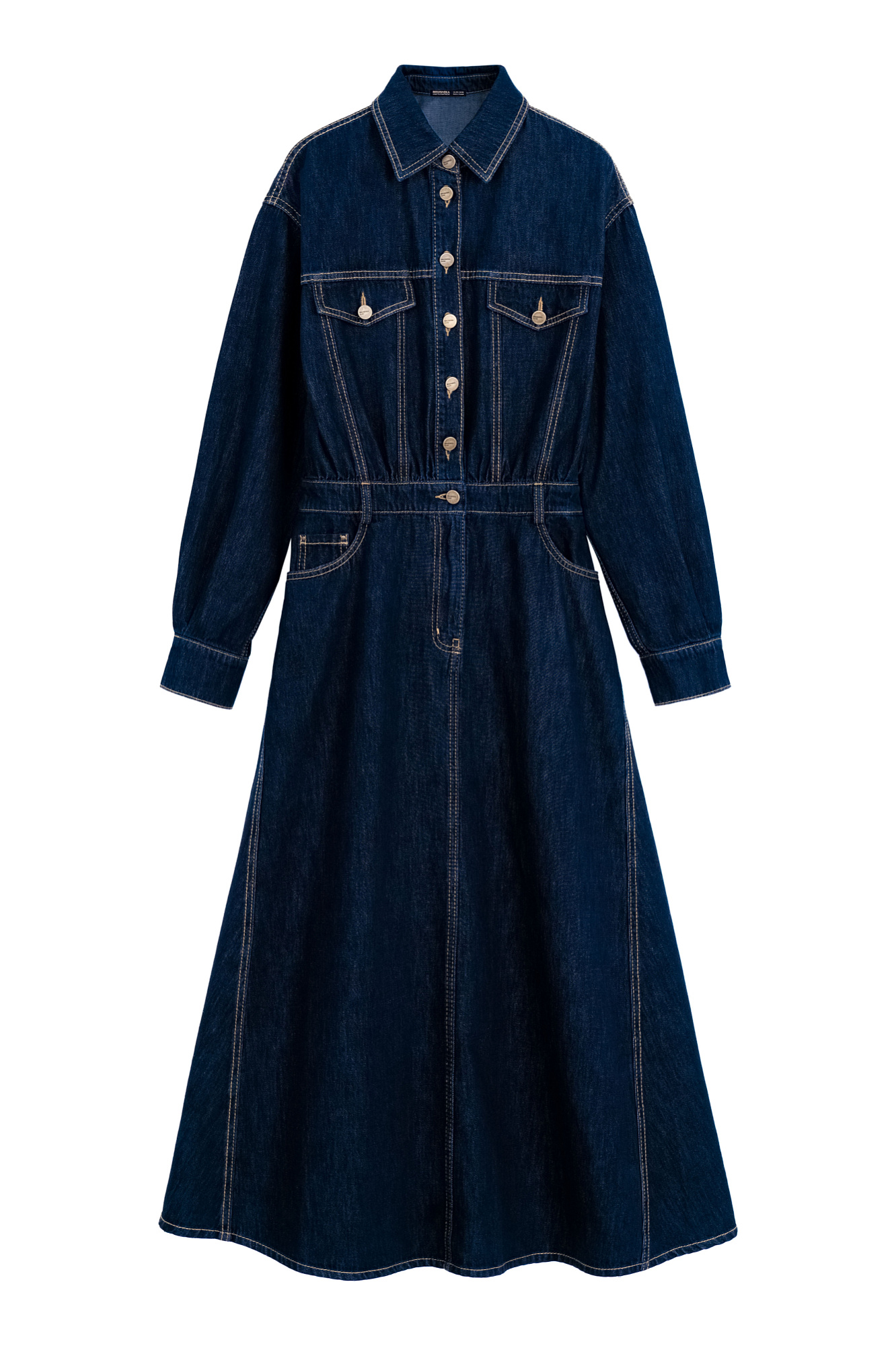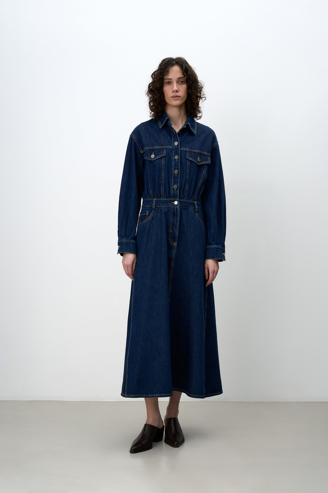 Джинсовое платье из 100% хлопка с рубашечным верхом и юбкой А-силуэта. Модель с длинными рукавами с манжетами, отложным воротником, карманами на груди с клапанами, шлевками на поясе для ремня, боковыми и задними карманами. Застежка на металлические пуговицы. Изделие декорировано вытачками контрастного цвета.