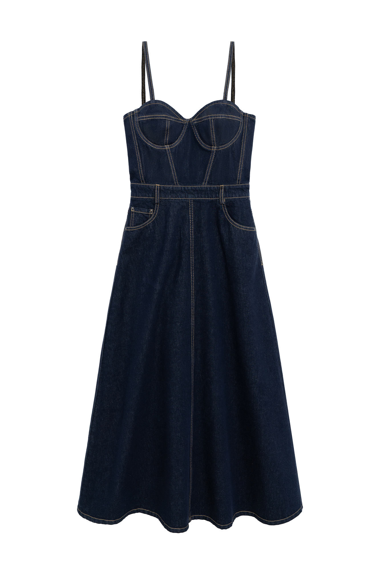 Джинсовый сарафан из 100% хлопка. Модель приталенного силуэта, на тонких бретелях, с акцентным лифом, глубоким вырезом декольте, шлевками на поясе для ремня, боковыми карманами, накладными карманами сзади и застежкой на молнию на спине.