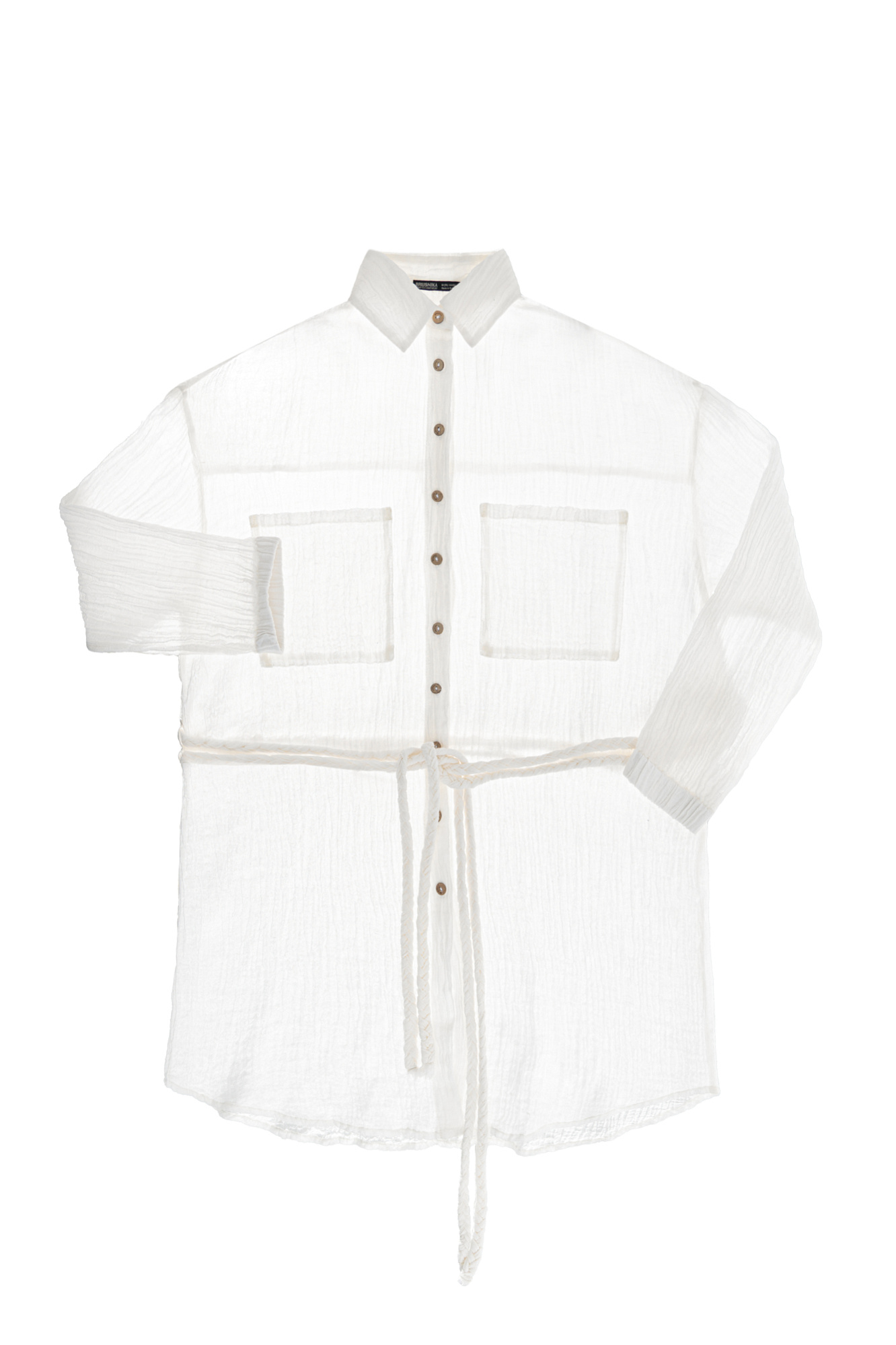 Платье-рубашка с накладными карманами на груди. Модель свободного силуэта со спущенной линией плеча и поясом в тон.