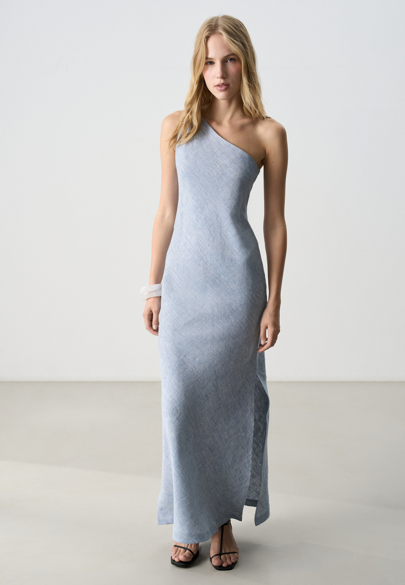 Платье длины макси из 100% льна. Модель асимметричного кроя, с перекрученной лямкой на одно плечо. Разрез сбоку.