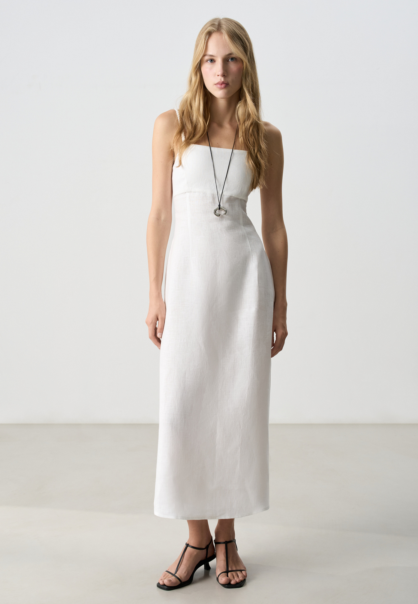 Сарафан длины миди из 100% льна. Модель приталенного силуэта, на тонких бретельках в виде косичек и высоким разрезом сбоку. Спинка изделия выполнена на резинке.