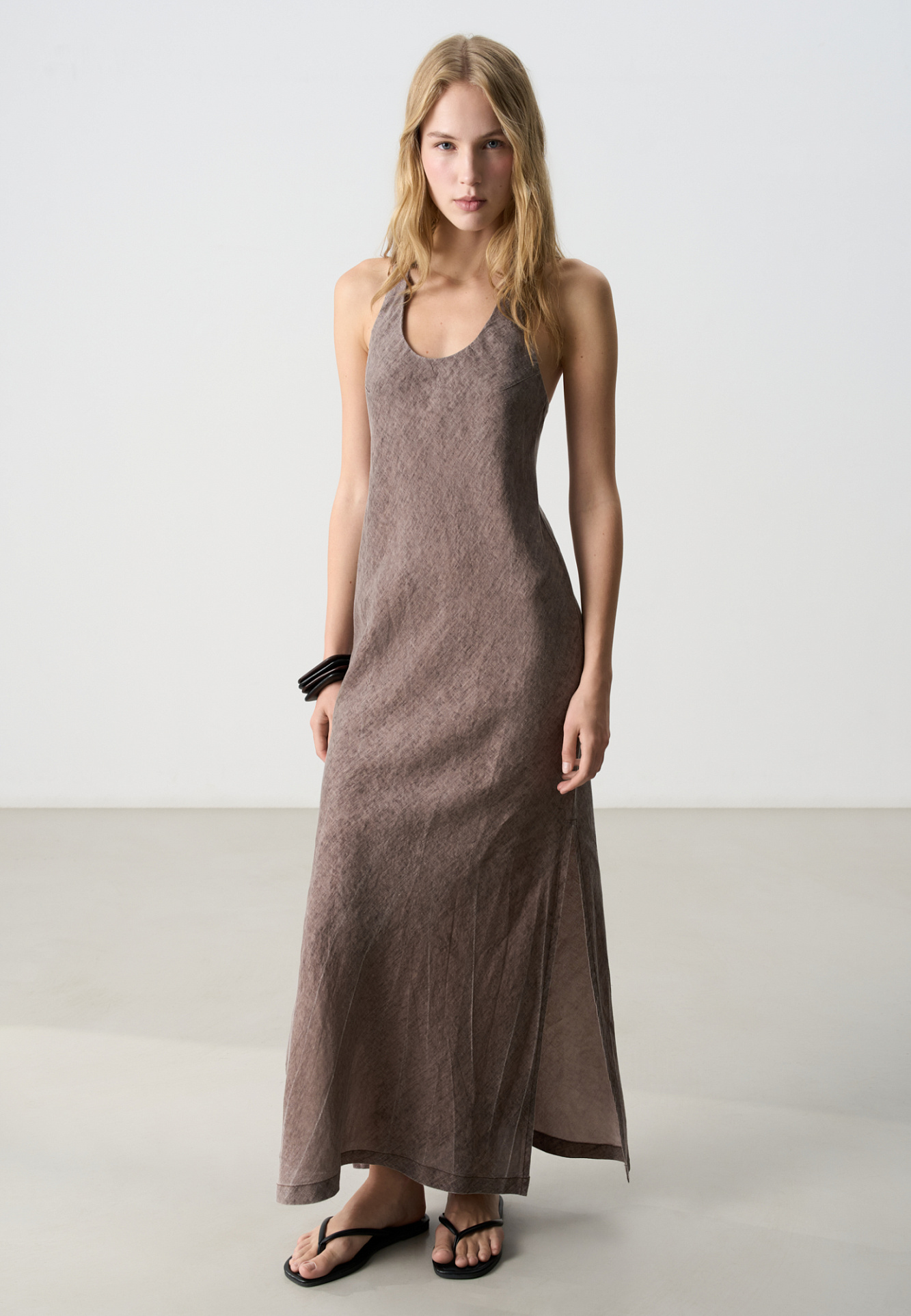 Сарафан из 100% льна длины макси. Модель свободного силуэта, без рукавов, на широких бретельках с перекрутом на спине, U-вырезом и симметричными разрезами на юбке по бокам.