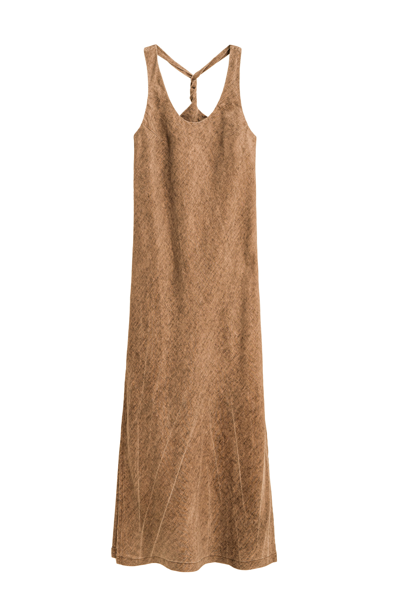 Сарафан из 100% льна длины макси. Модель свободного силуэта, без рукавов, на широких бретельках с перекрутом на спине, U-вырезом и симметричными разрезами на юбке по бокам.