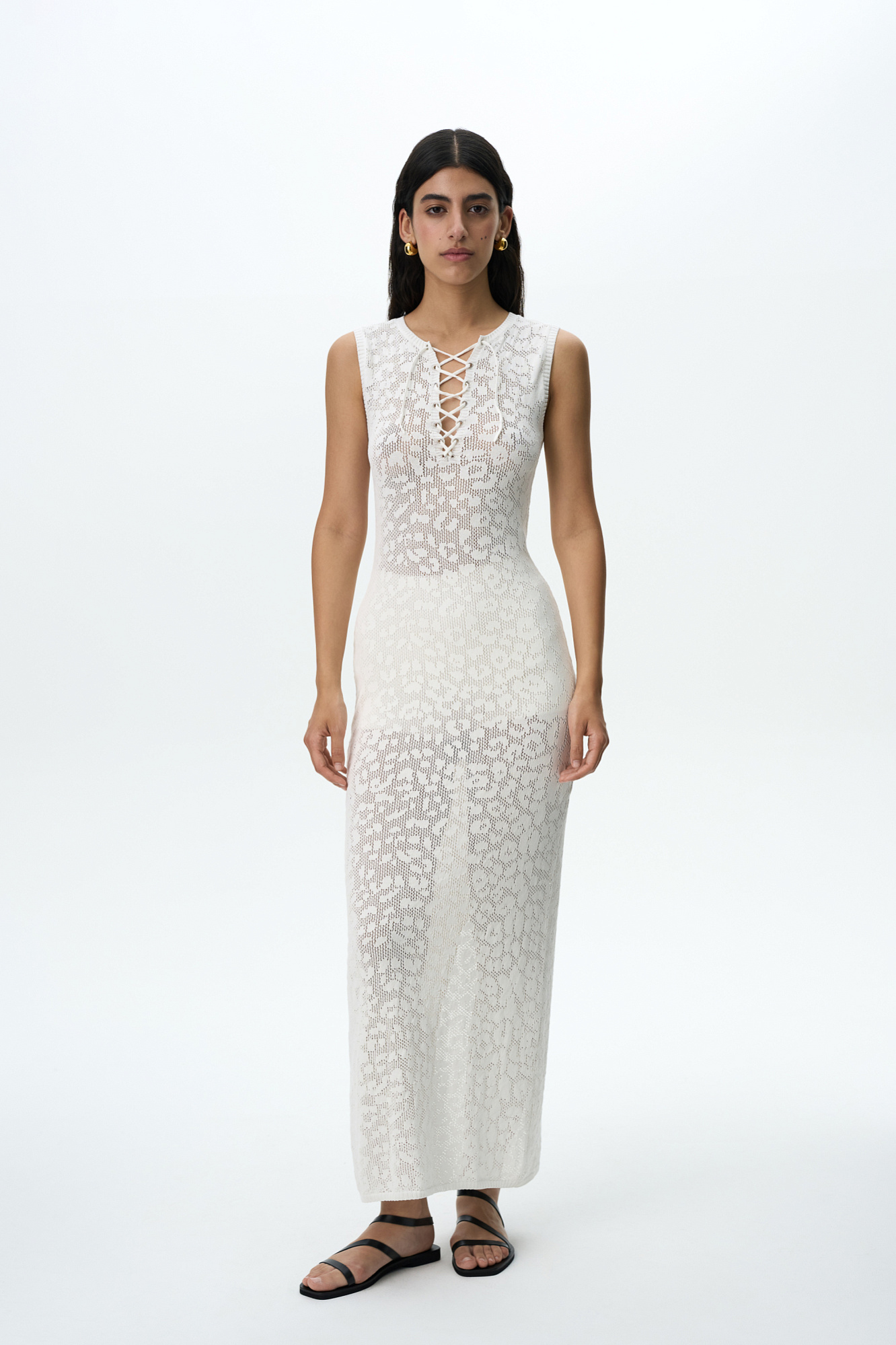 Трикотажное ажурное платье длины макси из органического хлопка. Модель приталенного силуэта, без рукавов, разрезом сзади и на груди. Изделие декорировано жаккардовым рисунком, имитирующим пятна леопарда.