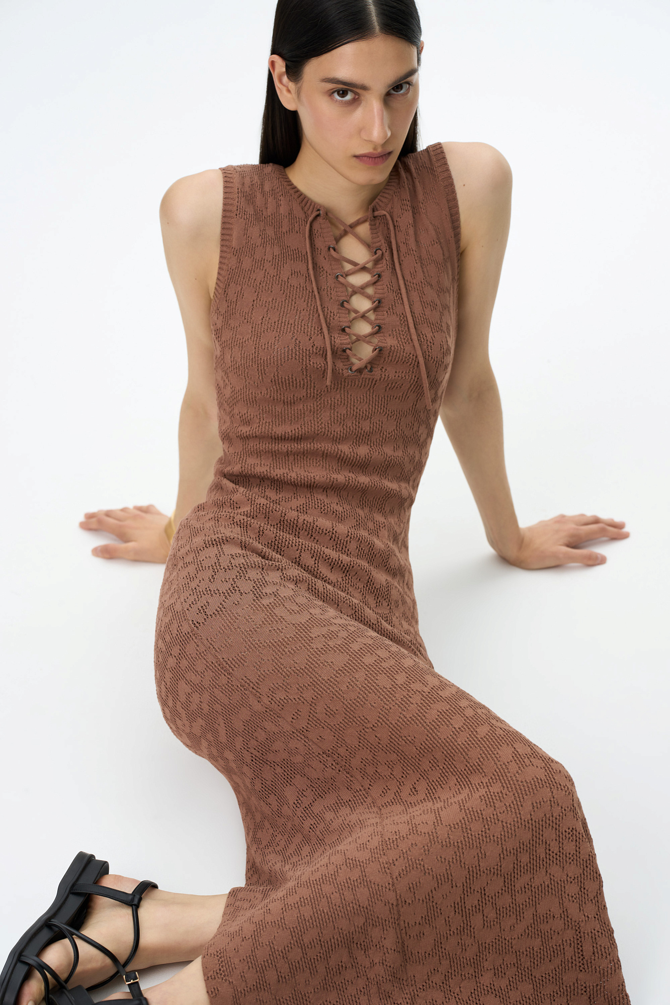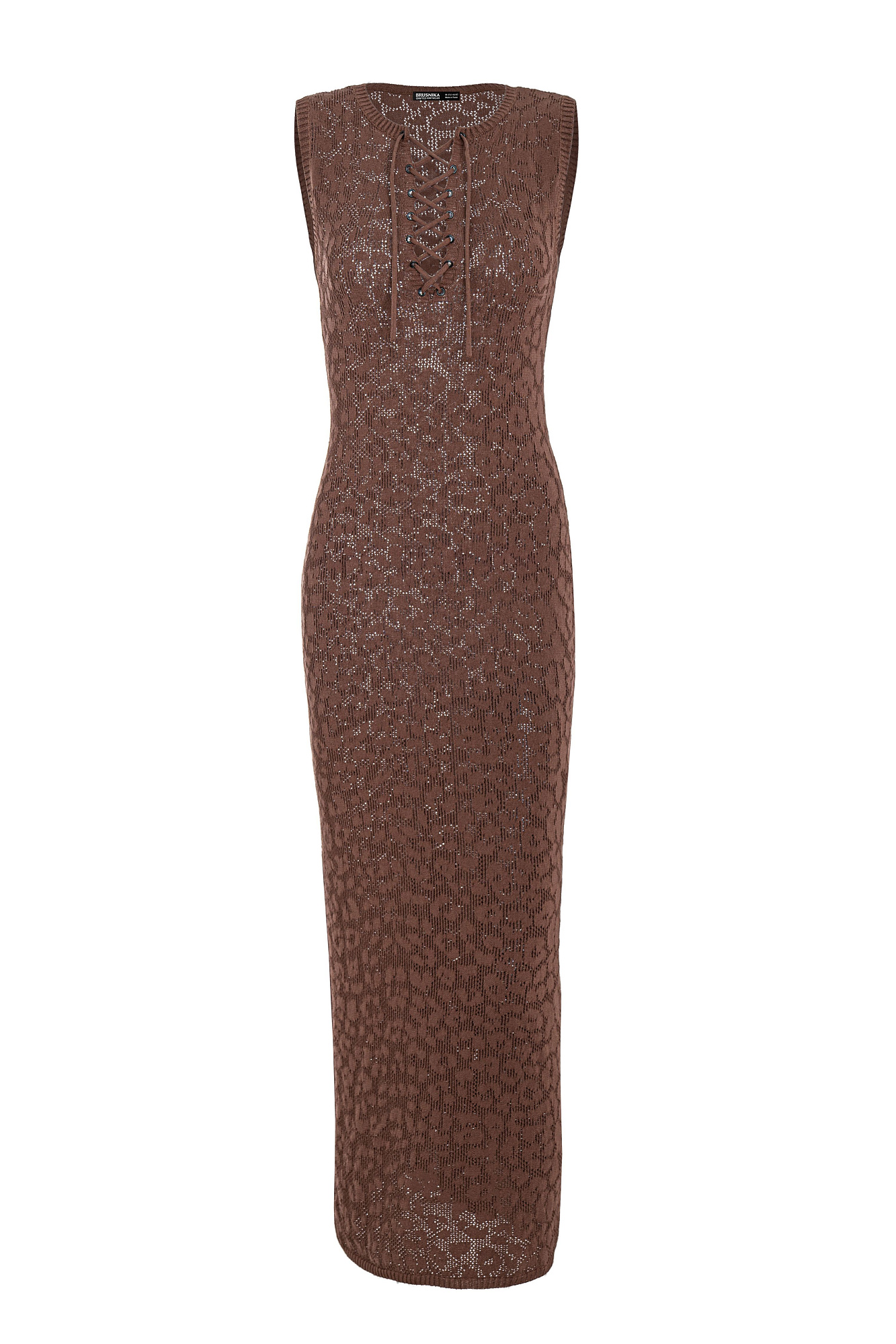 Трикотажное ажурное платье длины макси из органического хлопка. Модель приталенного силуэта, без рукавов, разрезом сзади и на груди. Изделие декорировано жаккардовым рисунком, имитирующим пятна леопарда.