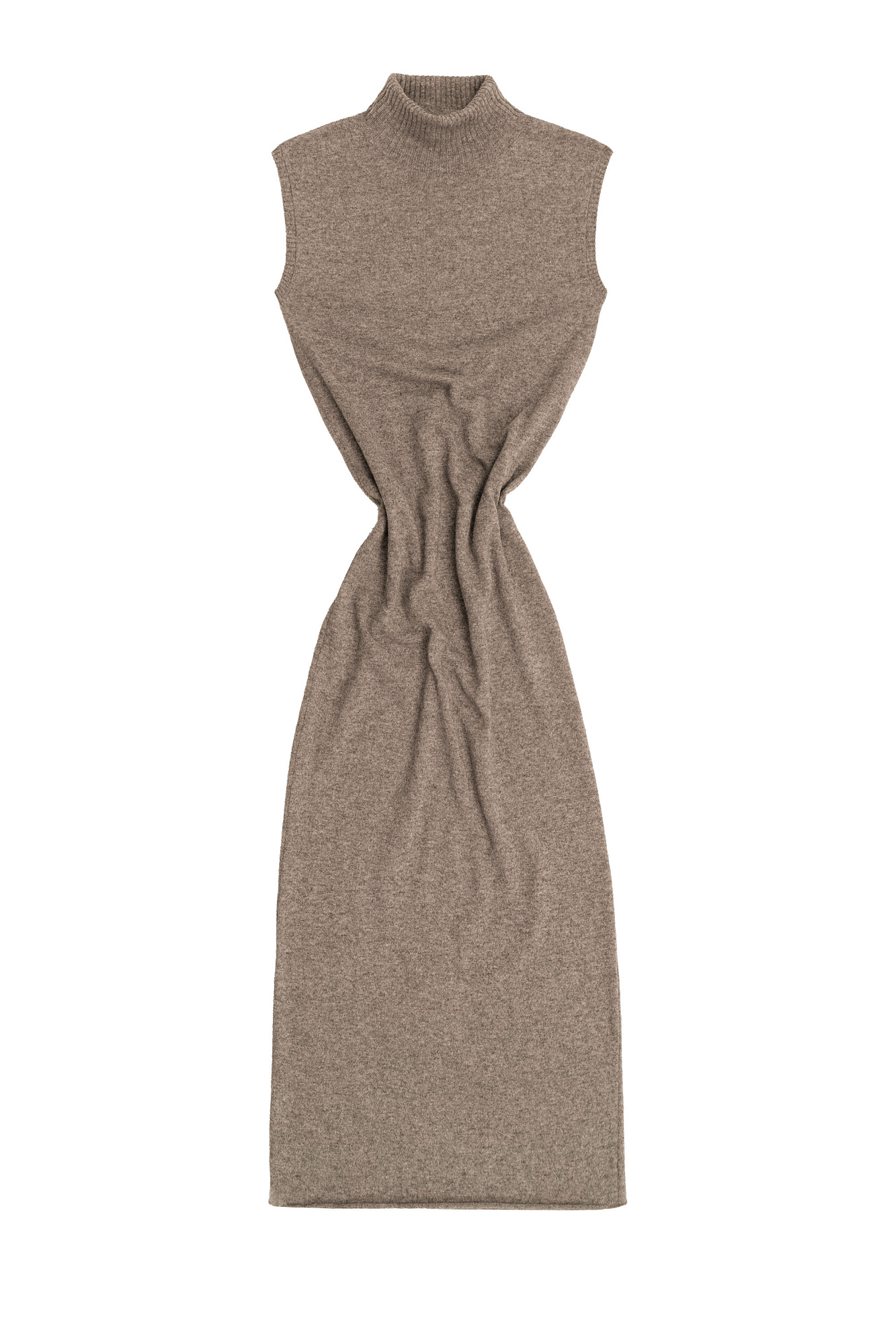 Трикотажное платье длины макси из шерсти и кашемира. Модель прямого кроя без рукавов и высоким воротником.