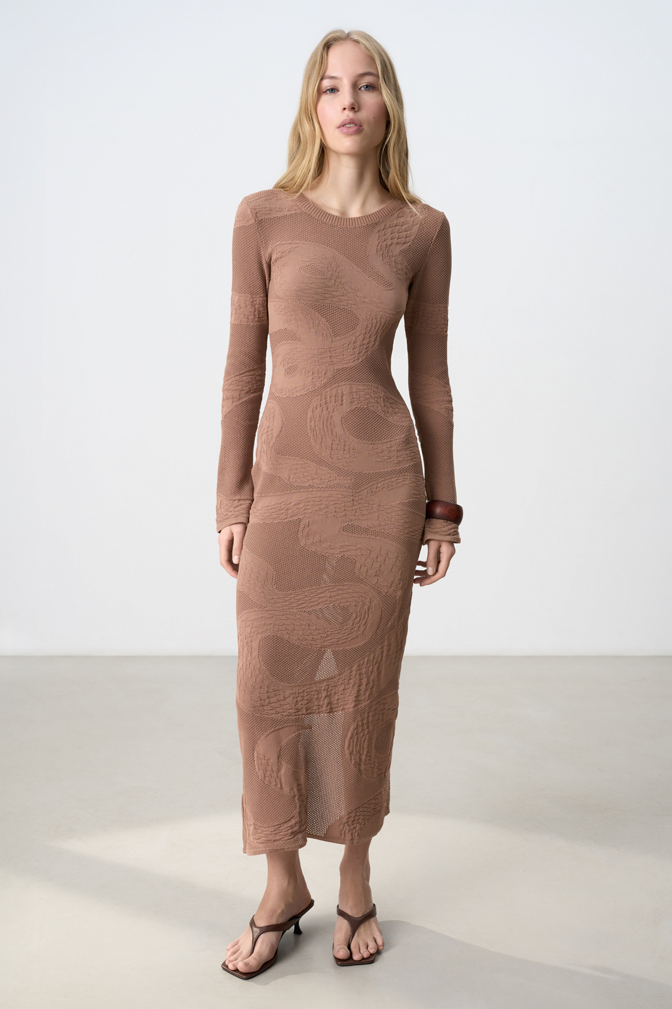Трикотажное платье длины макси из хлопка. Модель приталенного силуэта с круглым вырезом горловны и длинным рукавом. Изделие декорировано жаккардовым узором в виде змеи.