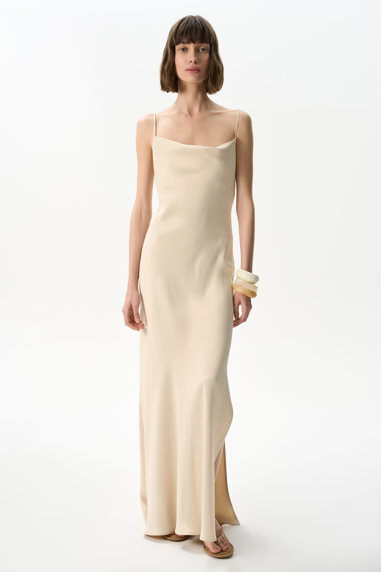 Атласное платье-комбинация длины миди из 100% вискозы. Модель приталенного силуэта, с высоким разрезом сбоку и открытой спиной,  Изделие выполнено на тонких регулируемых бретелях.