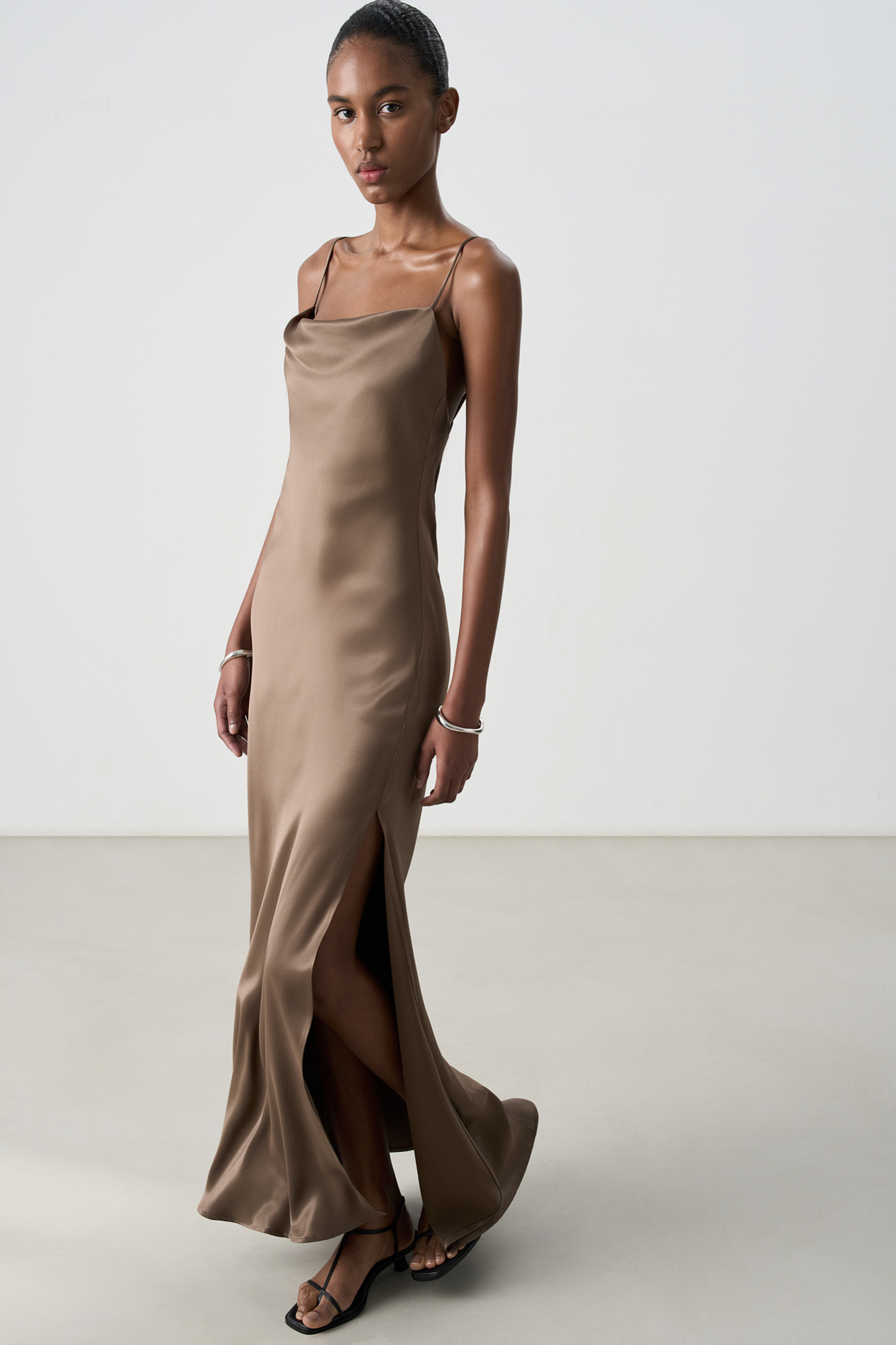 Атласное платье-комбинация длины миди из 100% вискозы. Модель приталенного силуэта, с высоким разрезом сбоку и открытой спиной. Изделие выполнено на тонких регулируемых бретелях.