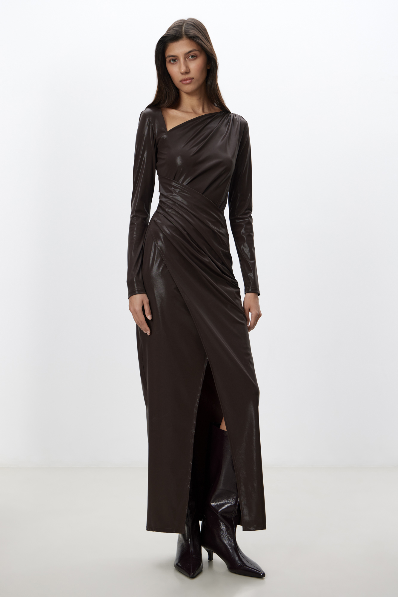 Платье длины макси с асимметричным вырезом и драпировкой. Модель приталенного силуэта с длинным рукавом и разрезом спереди.