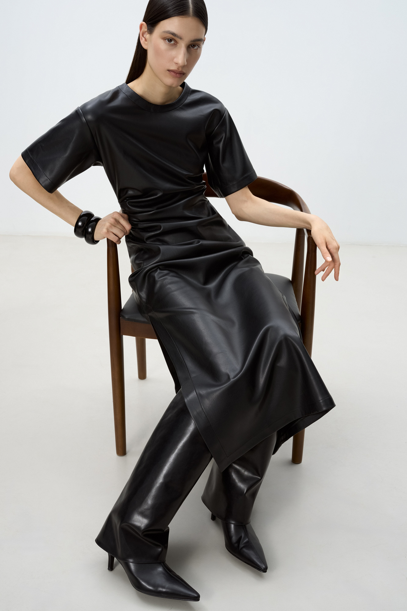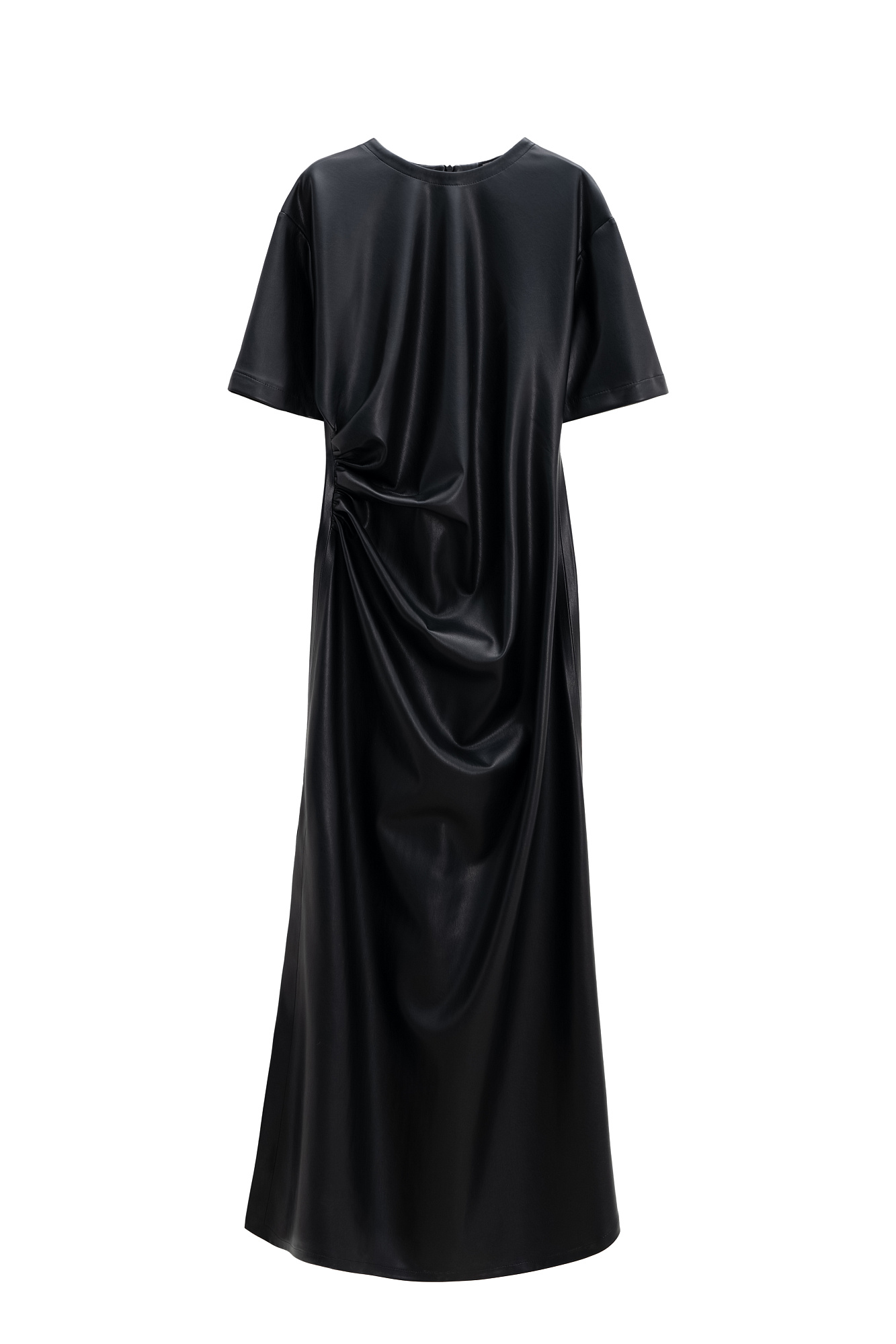 Длинное платье из экокожи. Модель свободного силуэта с коротким рукавом и круглым вырезом горловины. Изделие декорировано драпировкой и разрезом сбоку.