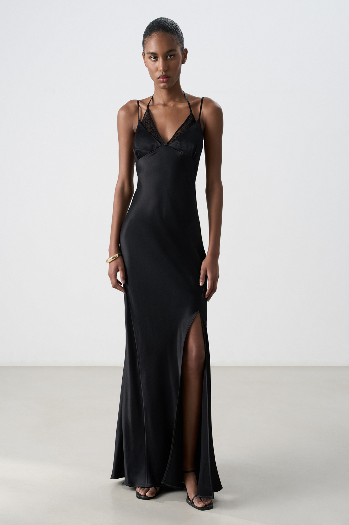 Платье-комбинация длины макси из атласной вискозы. Модель приталенного силуэта, на тонких регулируемых бретельках и высоким вырезом сбоку. Декольте изделия декорировано шифоновыми вставками.