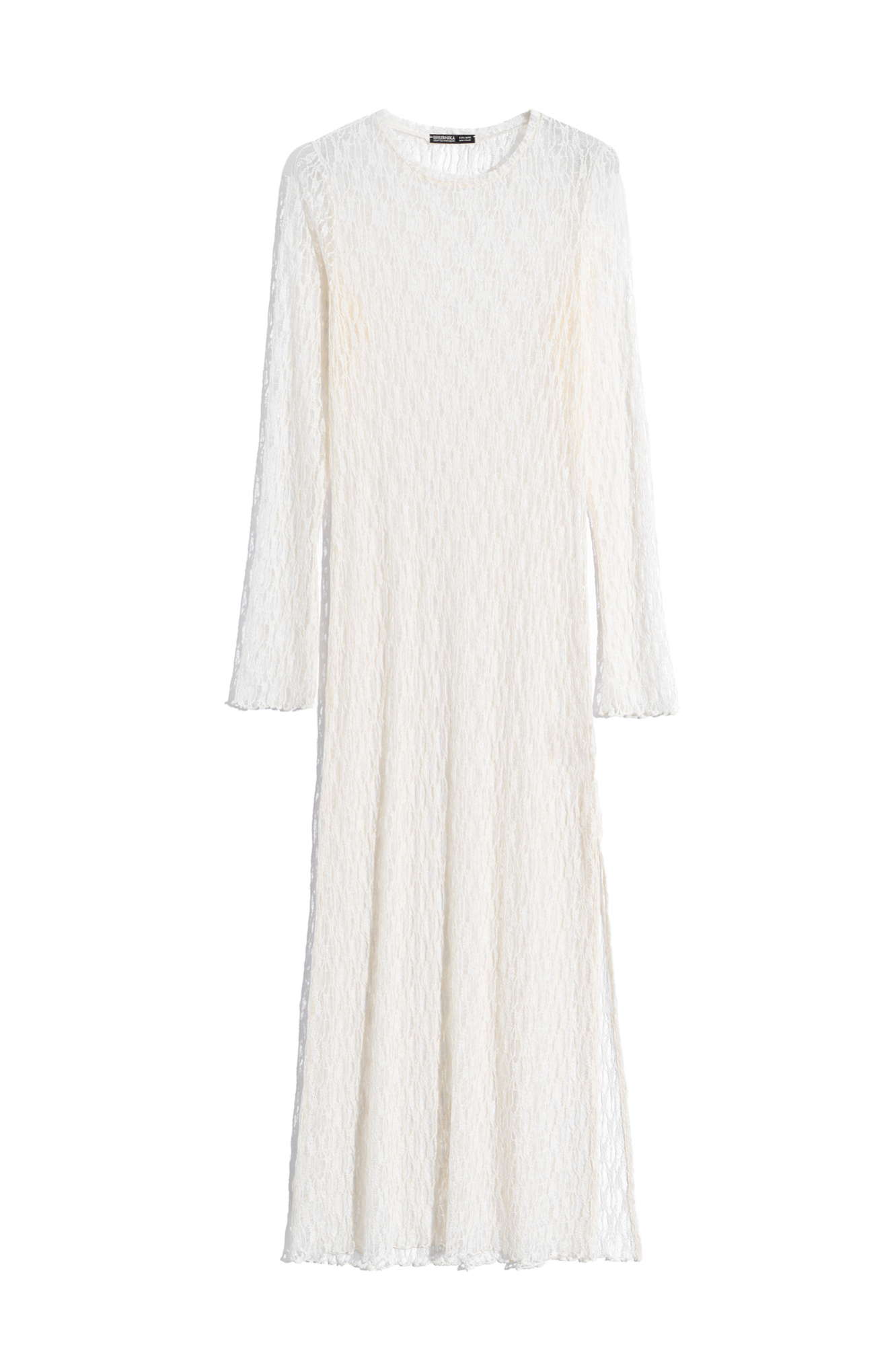 Платье длины макси из легкого кружева. Модель свободного силуэта с длинными рукавами, круглой горловиной и высоким разрезом на подоле. Изделие выполнено без подкладки.