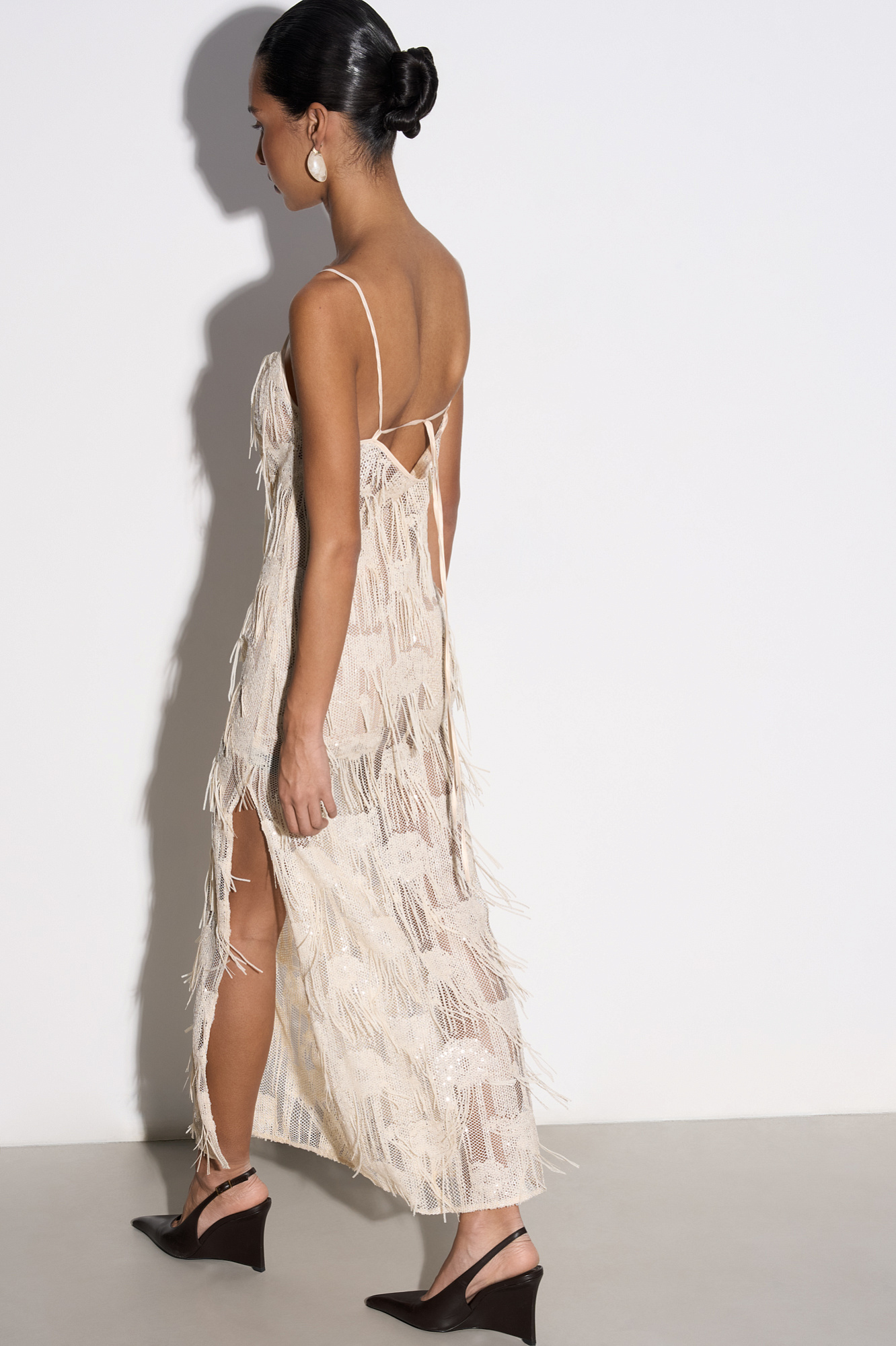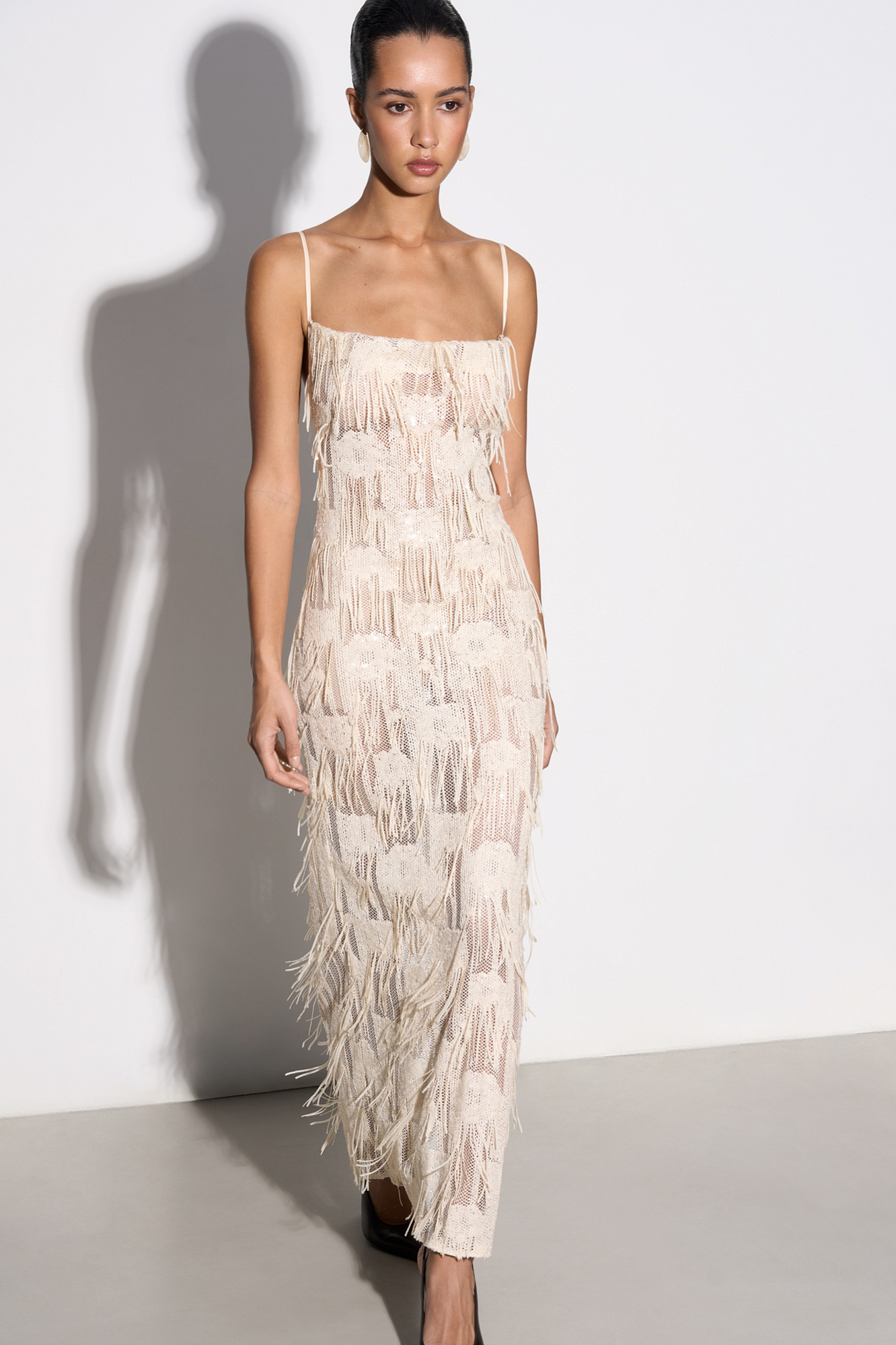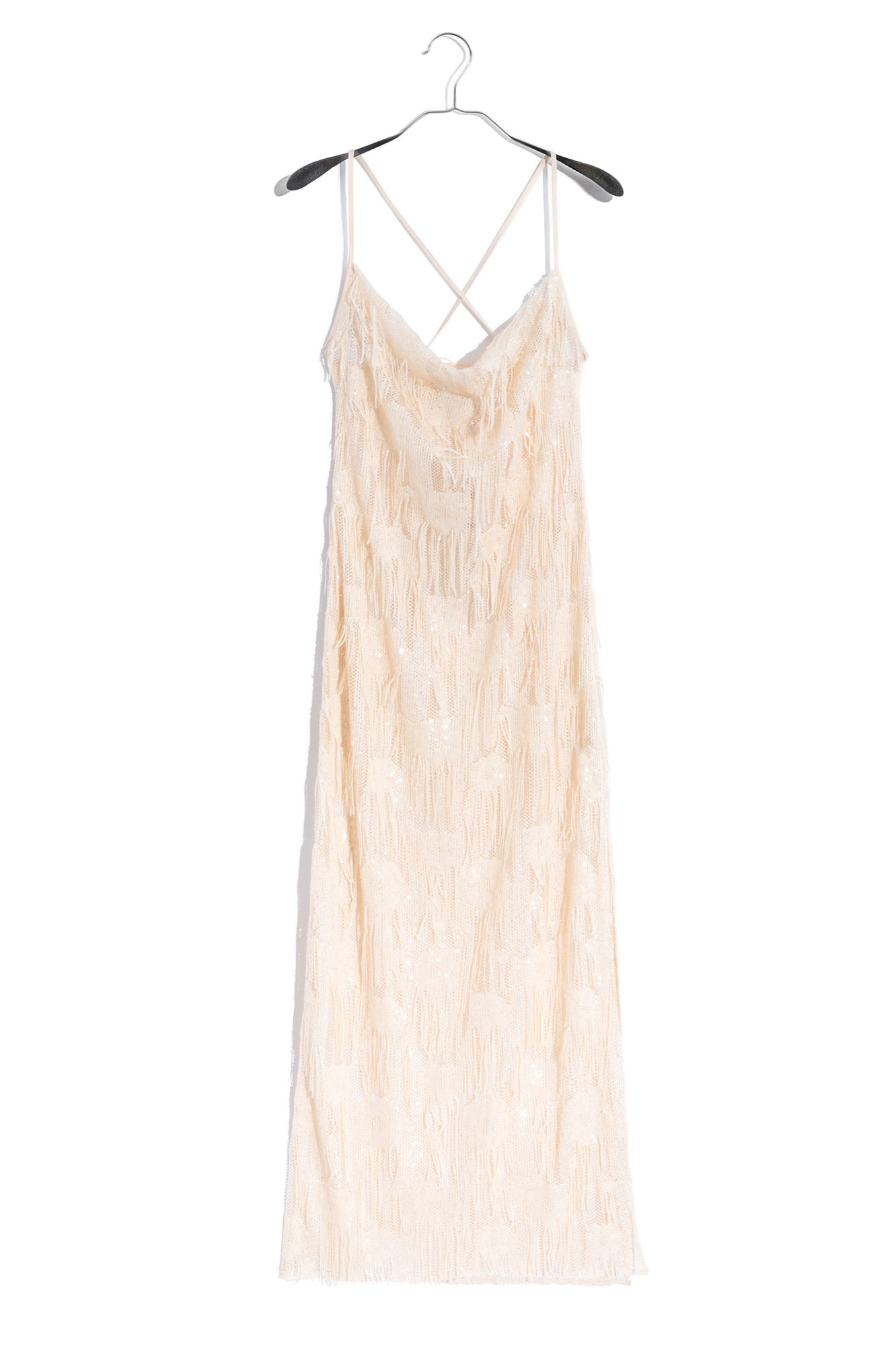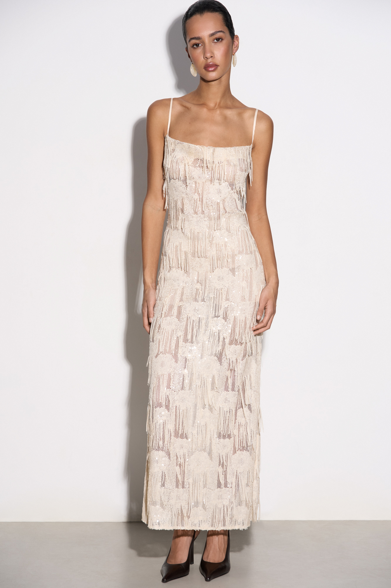 Платье длины макси с геометрическим орнаментом и бахромой, выполненными пайетками. Модель на тонких бретелях, без застежки. Изделие выполнено без подкладки.