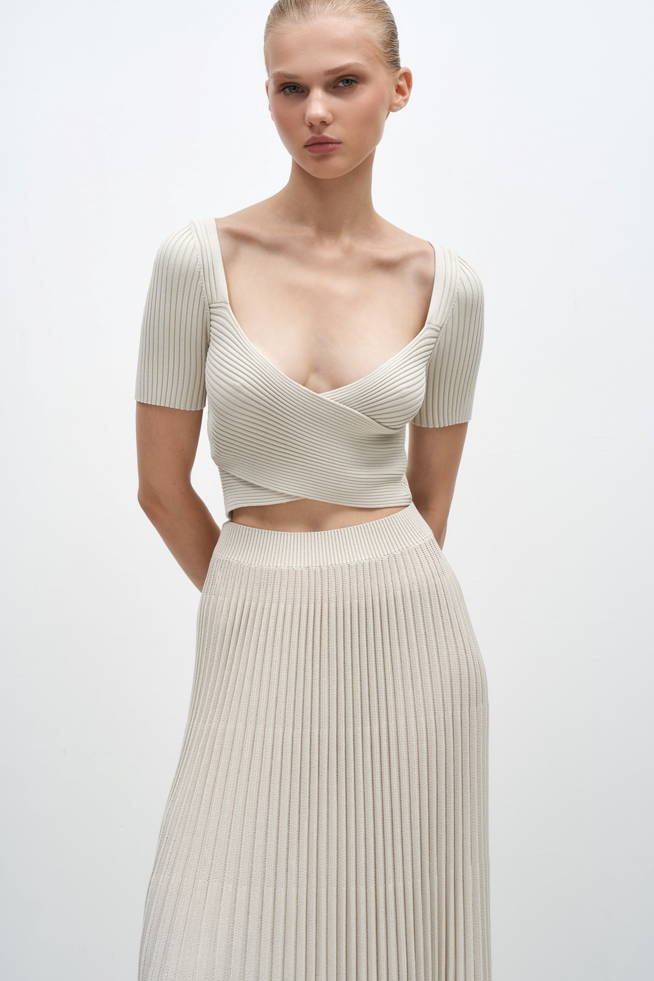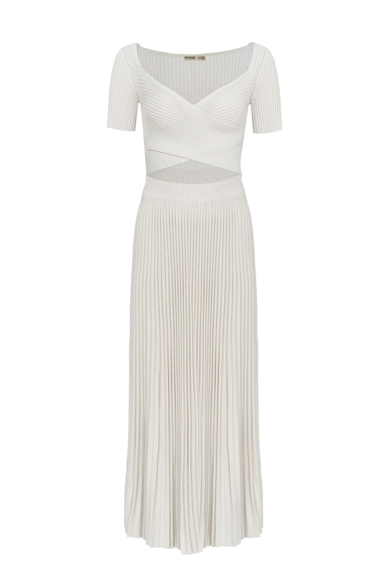 Трикотажное платье длины макси, выполненное из плотной вискозы. Модель с короткими рукавами, юбкой плиссе и вывязанным лифом.
