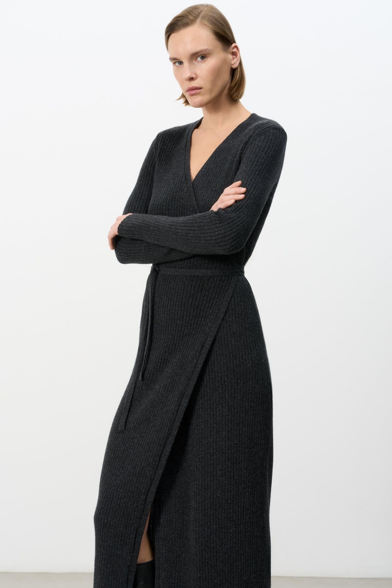 Платье на запах длины макси из шерсти и кашемира. Модель с длинными расклешенными рукавами, V-образным вырезом и поясом. Изделие выполнено в широкий рубчик.