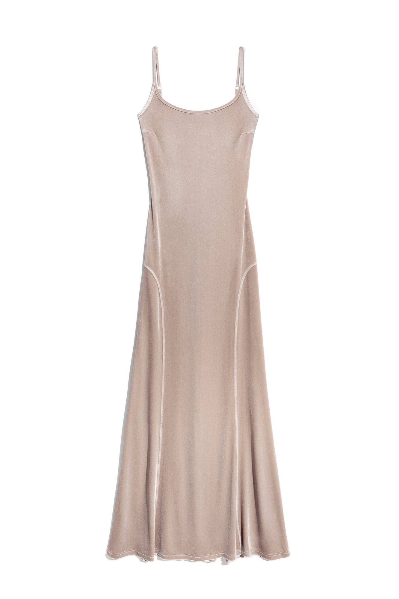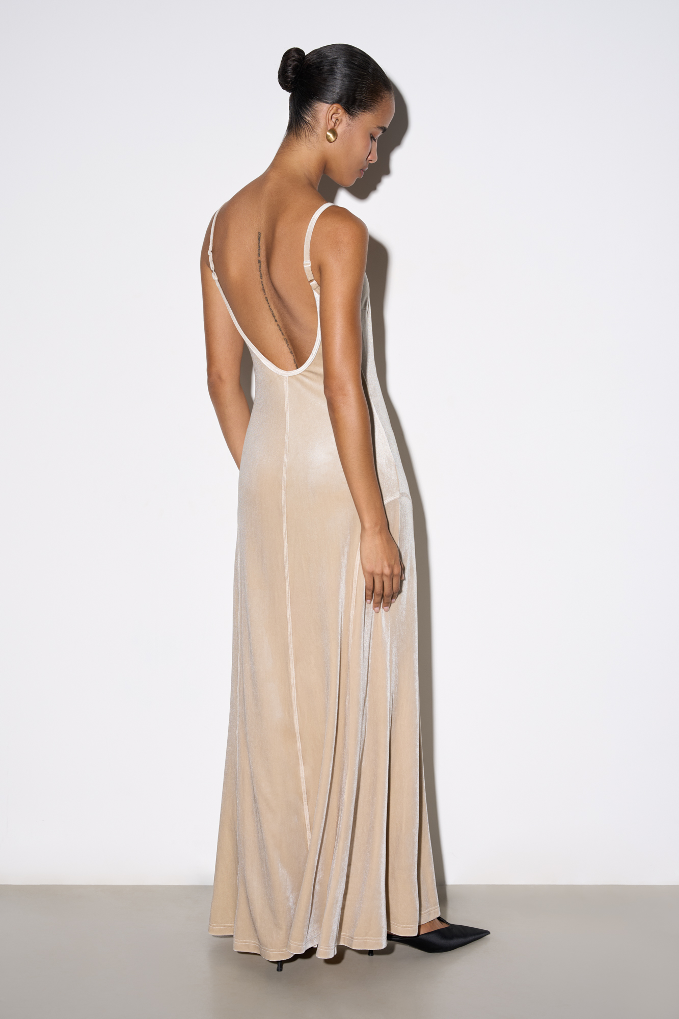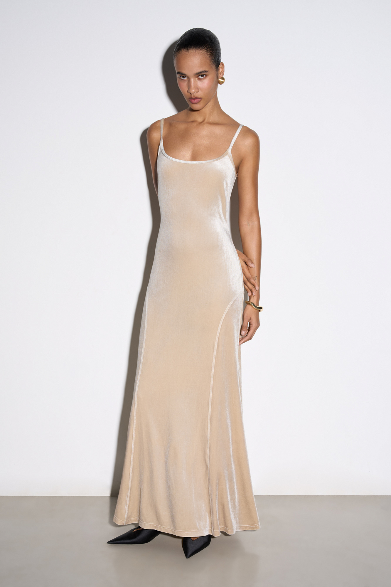 Бархатное платье длины макси из полиамида с добавлением вискозы. Модель приталенного силуэта, без рукавов, на тонких регулируемых бретельках и глубоким вырезом на спине.