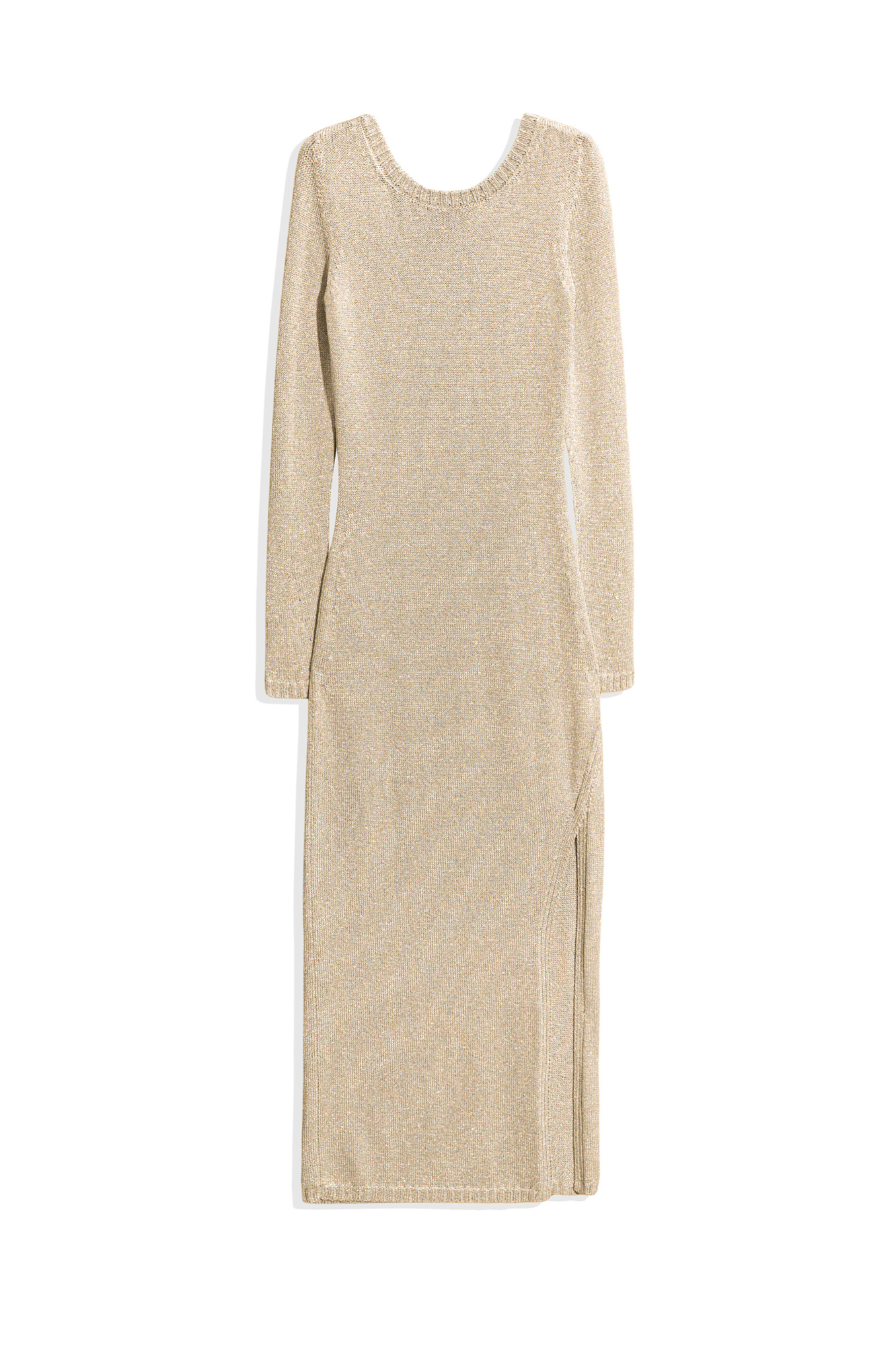 Трикотажное платье длины макси из вискозы с добавлением люрекса. Модель по фигуре с длинными рукавами, круглым вырезом горловины, вырезом на спине и разрезом на подоле сбоку. Края изделия выполнены в рубчик.