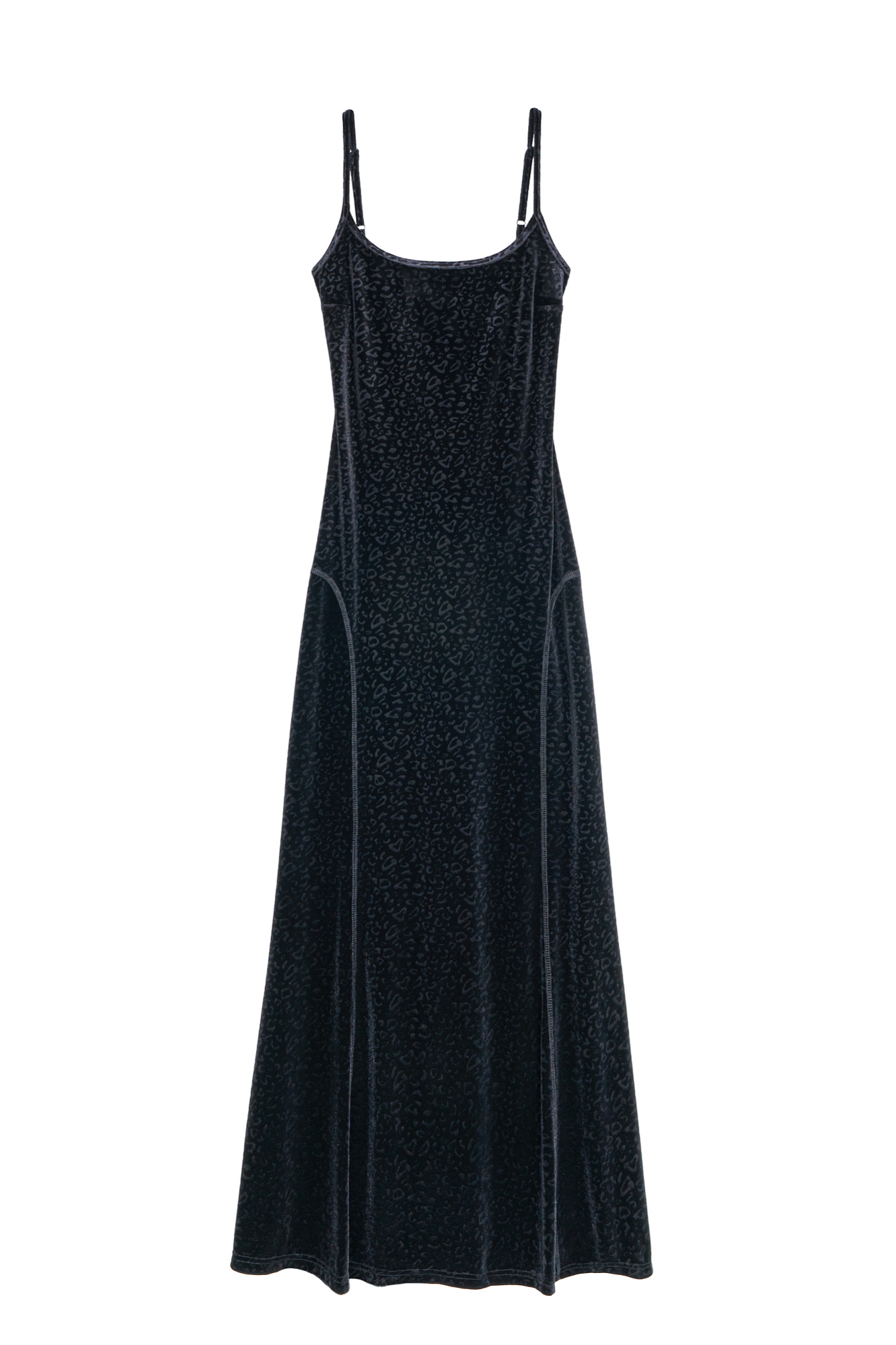 Платье длины макси из бархата с анималистичным принтом. Модель приталенного силуэта на тонких регулируемых бретельках.