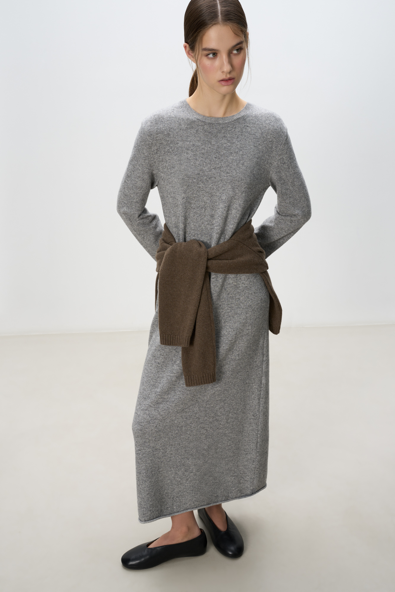 Трикотажное платье длины макси из шерсти с добавлением кашемира. Модель свободного силуэта с длинными рукавами, круглым вырезом горловины и валиком по низу изделия.