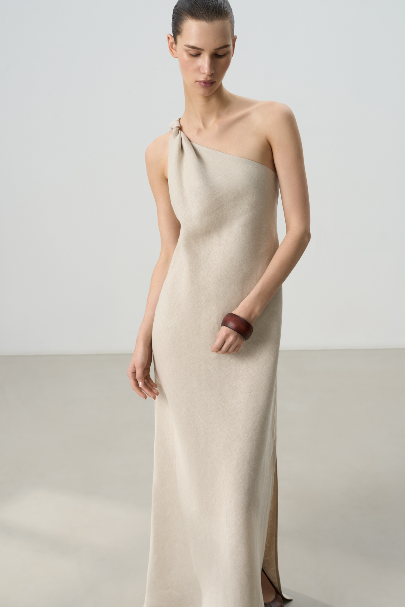 Платье длины макси из 100% льна. Модель асимметричного кроя, с перекрученной лямкой на одно плечо. Разрез сбоку.
