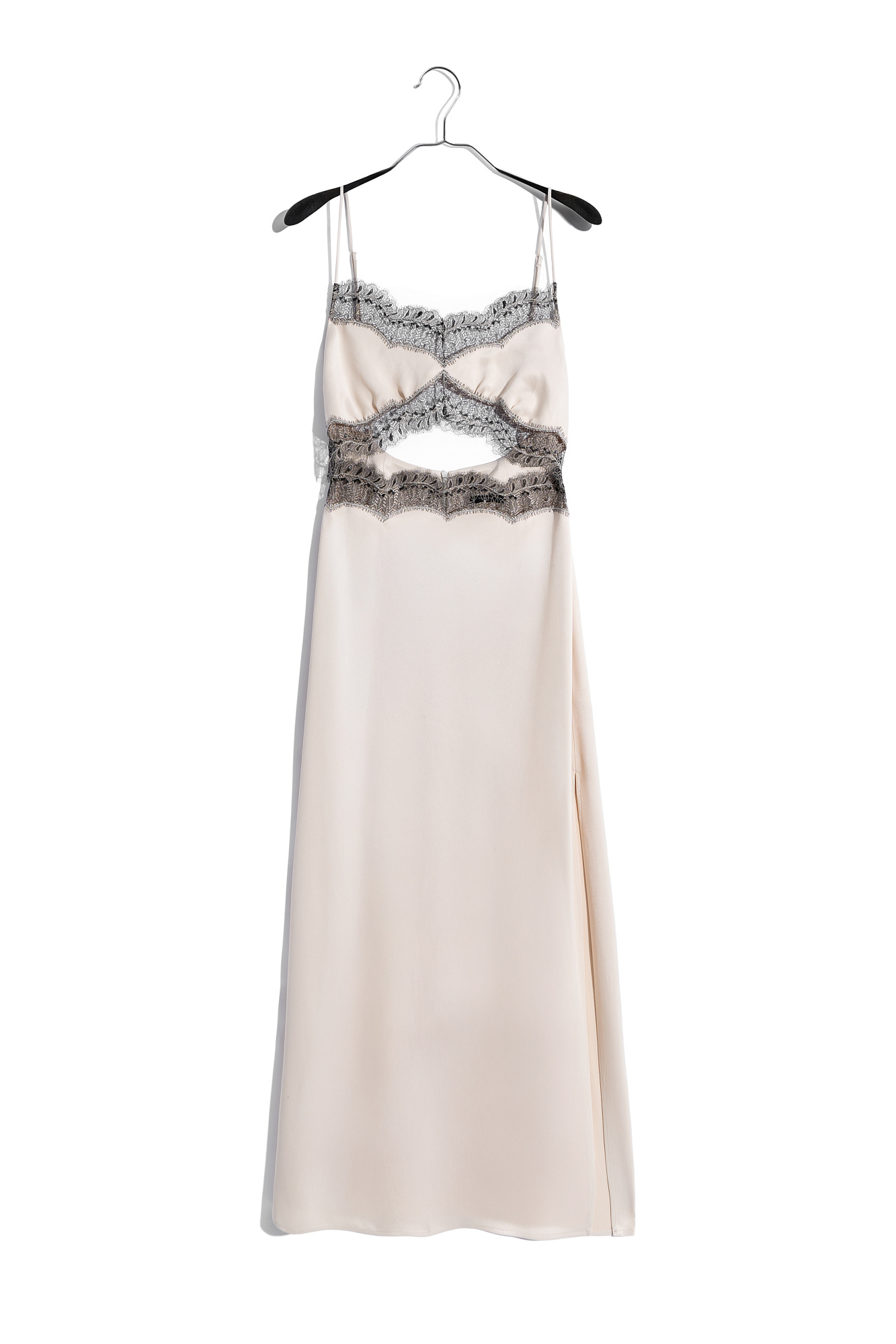 Атласное платье длины макси, декорированное кружевом. Модель приталенного силуэта на тонких бретелях, с открытой спиной и вырезом под грудью. Застежка на потайную молнию.