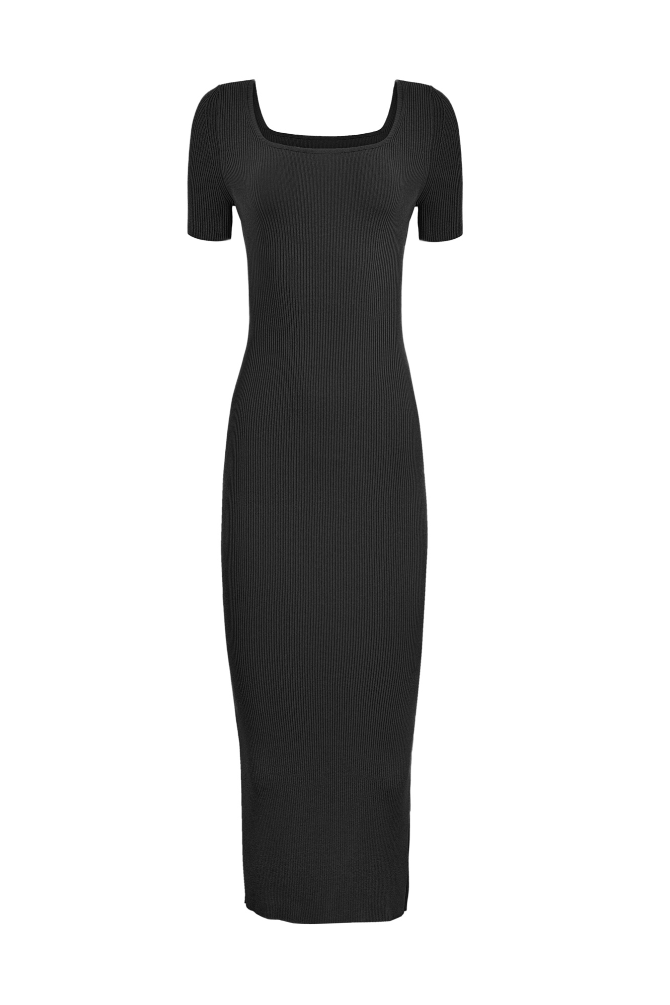 Трикотажное платье из вискозы в рубчик. Модель облегающего силуэта, с короткими рукавами, широким округлым вырезом горловины и разрезом сзади.