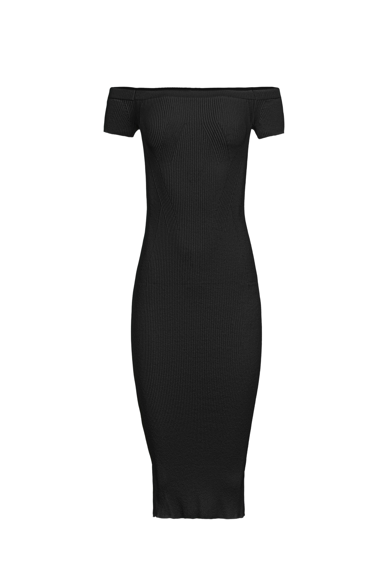 Трикотажное платье из вискозы. Модель приталенного силуэта длины миди, с открытой линией плеч и разрезом сзади.