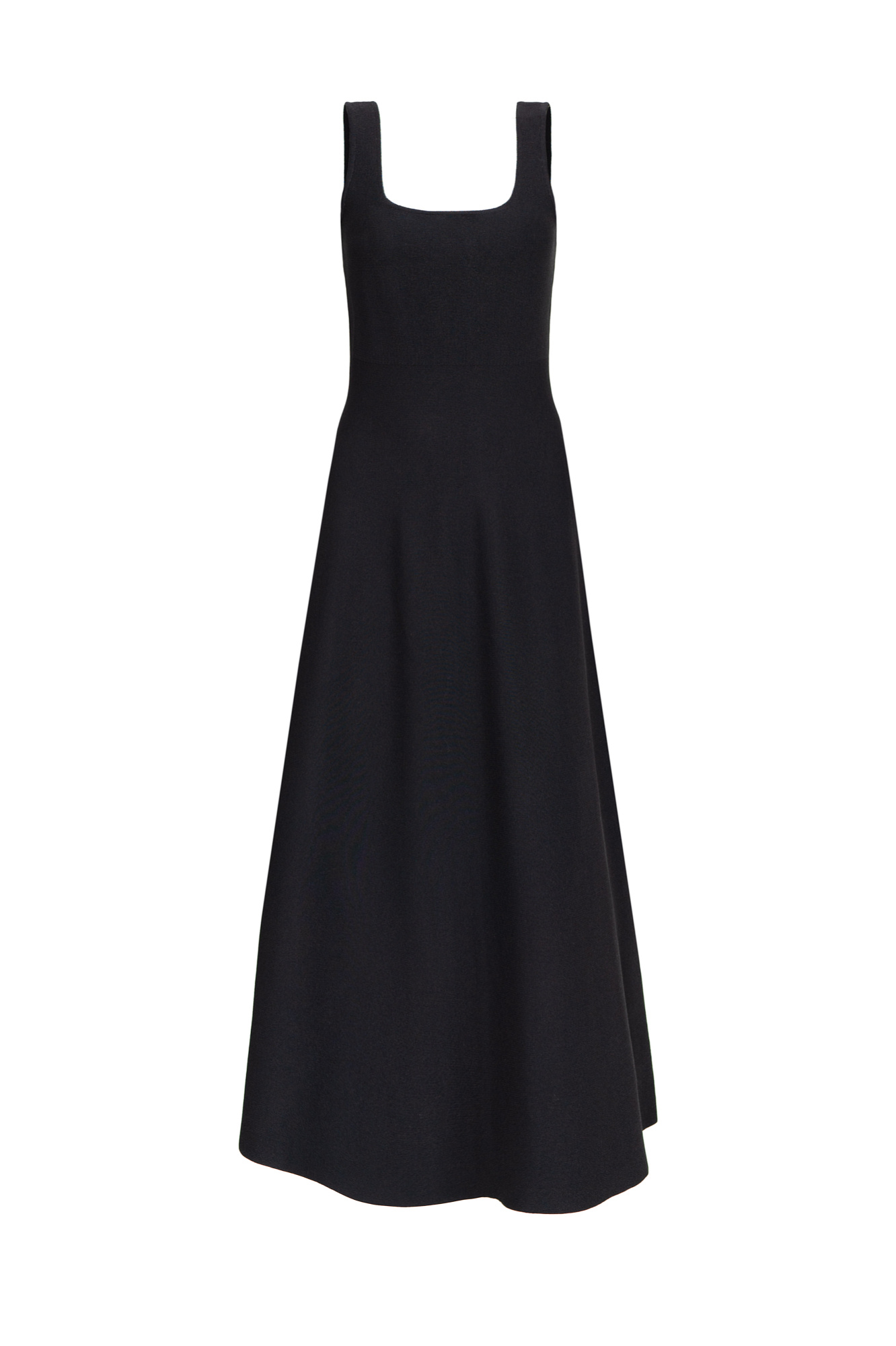 Трикотажное платье длины миди из плотной вискозы. Модель без рукавов, на широких бретелях и юбкой А-силуэта. Застежка на молнию сзади.