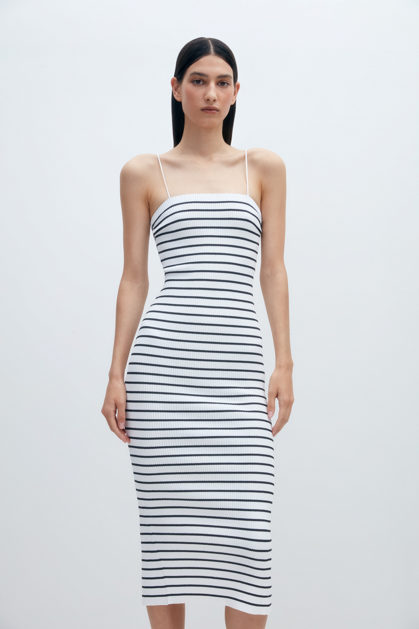 Трикотажное платье длины миди из вискозы в рубчик. Модель приталенного силуэта, на тонких бретельках и разрезом сзади.