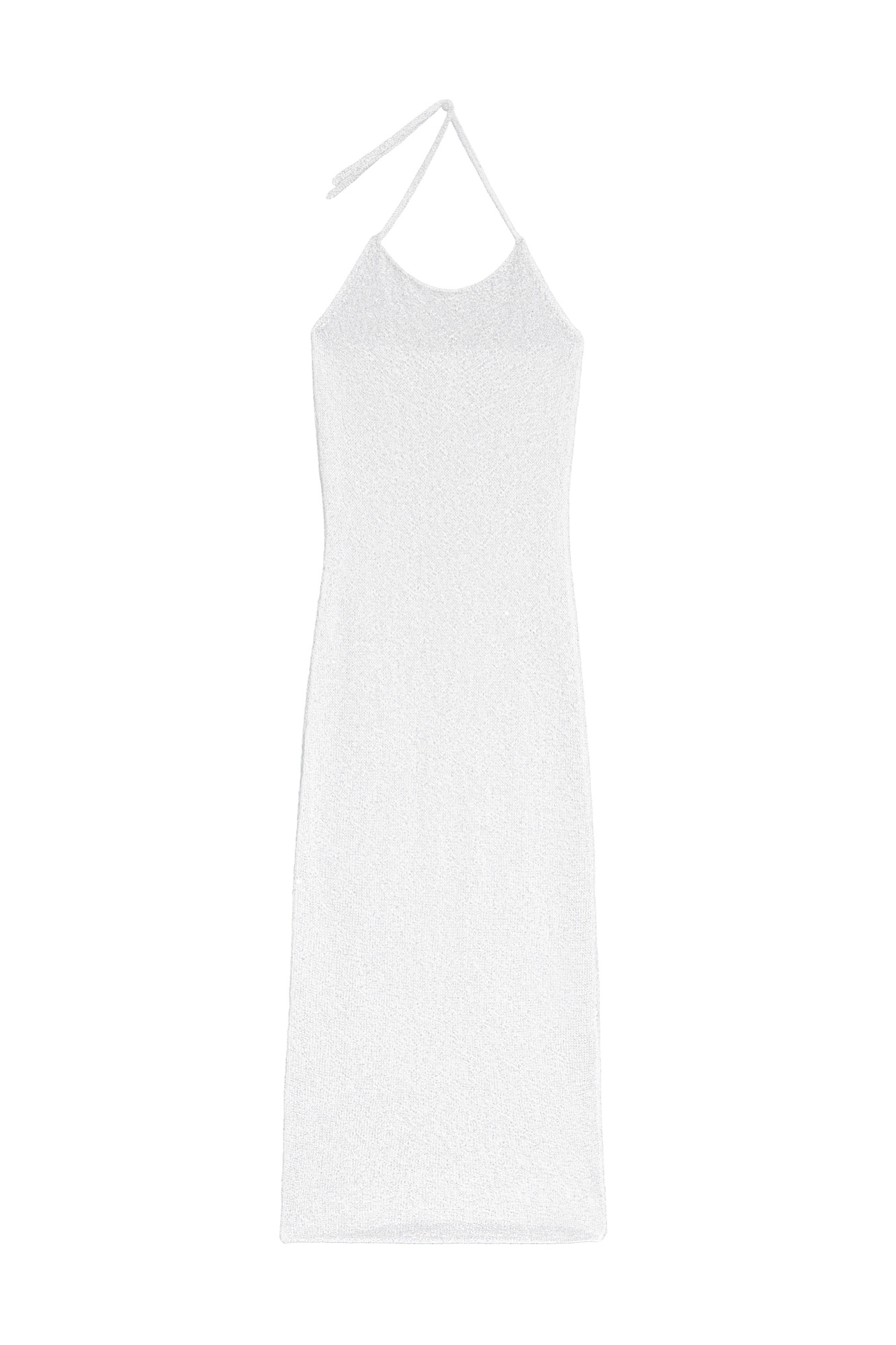 Трикотажное платье длины миди из хлопка с добавлением вискозы. Изделие декорировано мелкими пайетками. Модель прямого кроя с открытой спиной и двумя лямками-завязками на шее. Без подкладки.
